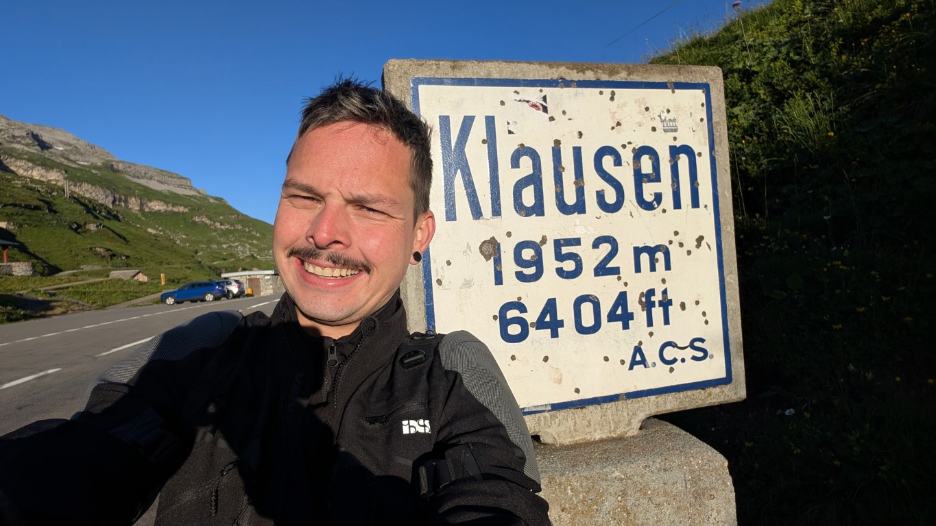Kurz nach halb fünf Uhr morgens startete die Tour. Mein erstes Ziel war der Klausenpass. Bis nach Altdorf fuhr ich auf der Autobahn. Es war noch kühl, und ich war dankbar für die Griffheizung der Suzuki GSX S1000 GX. Der Tempomat bewahrte mich vor unnötigen Bussen. Im Kanton Uri konnte ich die Autobahn verlassen. Nachdem ich ein paar Bauern mit ihren Milchtanks überholt hatte, gehörte die Straße mir, und ich konnte sie in vollen Zügen genießen. Oben auf dem Pass angekommen, gab es das erste Pass-Selfie mit dem Schild der Passhöhe. Leider war das Restaurant noch geschlossen, also fuhr ich ohne einen erfrischenden Kaffee weiter. Nun ging es hinunter ins Glarnerland, denn der nächste Pass sollte der Flüelapass sein. Doch zuvor legte ich einen kurzen Zwischenstopp an einer Tankstelle ein – ich brauchte dringend einen Kaffee.