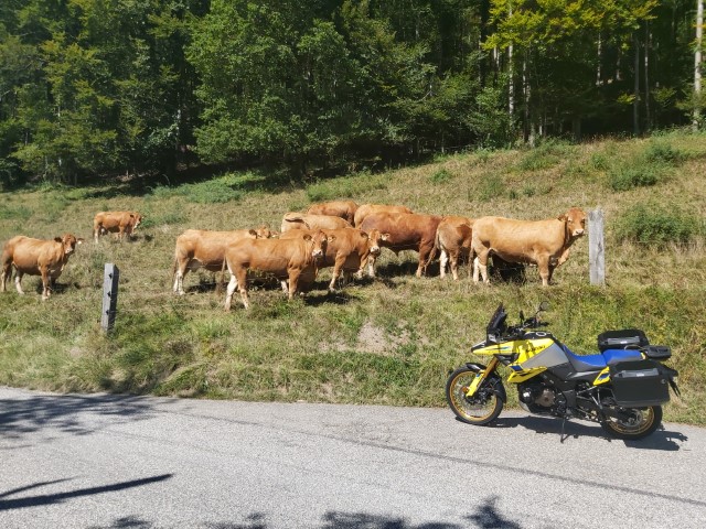 Bis zur Ausfahrt waren noch ein paar Tage hin, die ich nutzte, um die Suzuki V-Strom 1050 DE Extrem besser kennen zu lernen. Denn der Journalist, der nicht die Ganze Fahrt im Sattel bleiben konnte, ging mir nicht aus dem Kopf. Auch nicht als ich im Jura einen Halt für ein Foto mit coolen Kühen machen wollte. Die Fotos wurden gut und ich wollte wieder losfahren. Die Suzuki V-Strom 1050 DE Extrem stand auf einem leicht schrägen Untergrund. Die V-Strom 1050 DE hat eine Sitzhöhe von 880 mm, was für mich mit 175cm doch etwas hoch ist. Als ich dann in dieser leichten Neigung wieder auf das Motorrad aufsteigen wollte, musste ich an Florian von Suzuki denken, denn ich kam nicht mehr aufs Motorrad. Man merke, der Parkplatz muss überlegt ausgewählt werden.