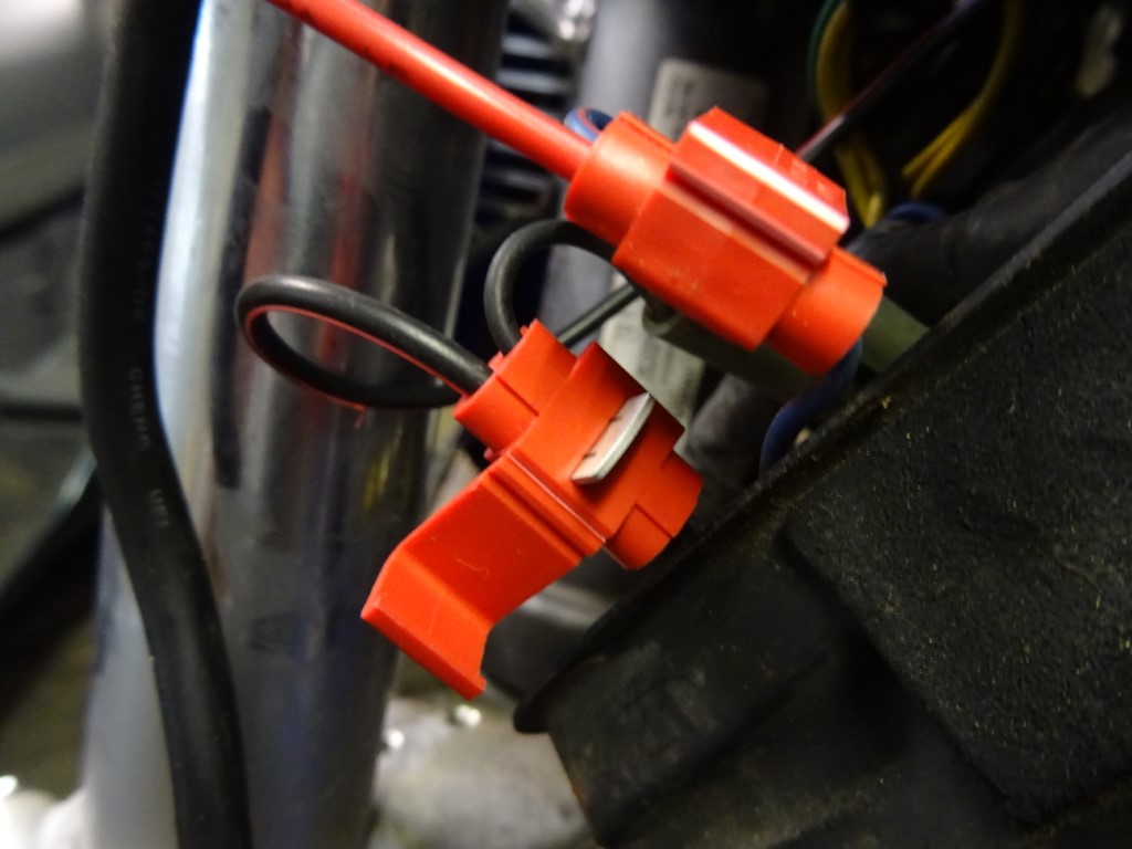 2.Polarität prüfen und Navikabel mit Hilfe von Abzweigverbindern mit dem Abblendlicht oder Standlicht parallel verbinden.
