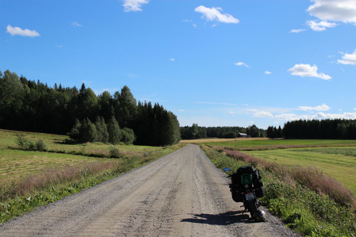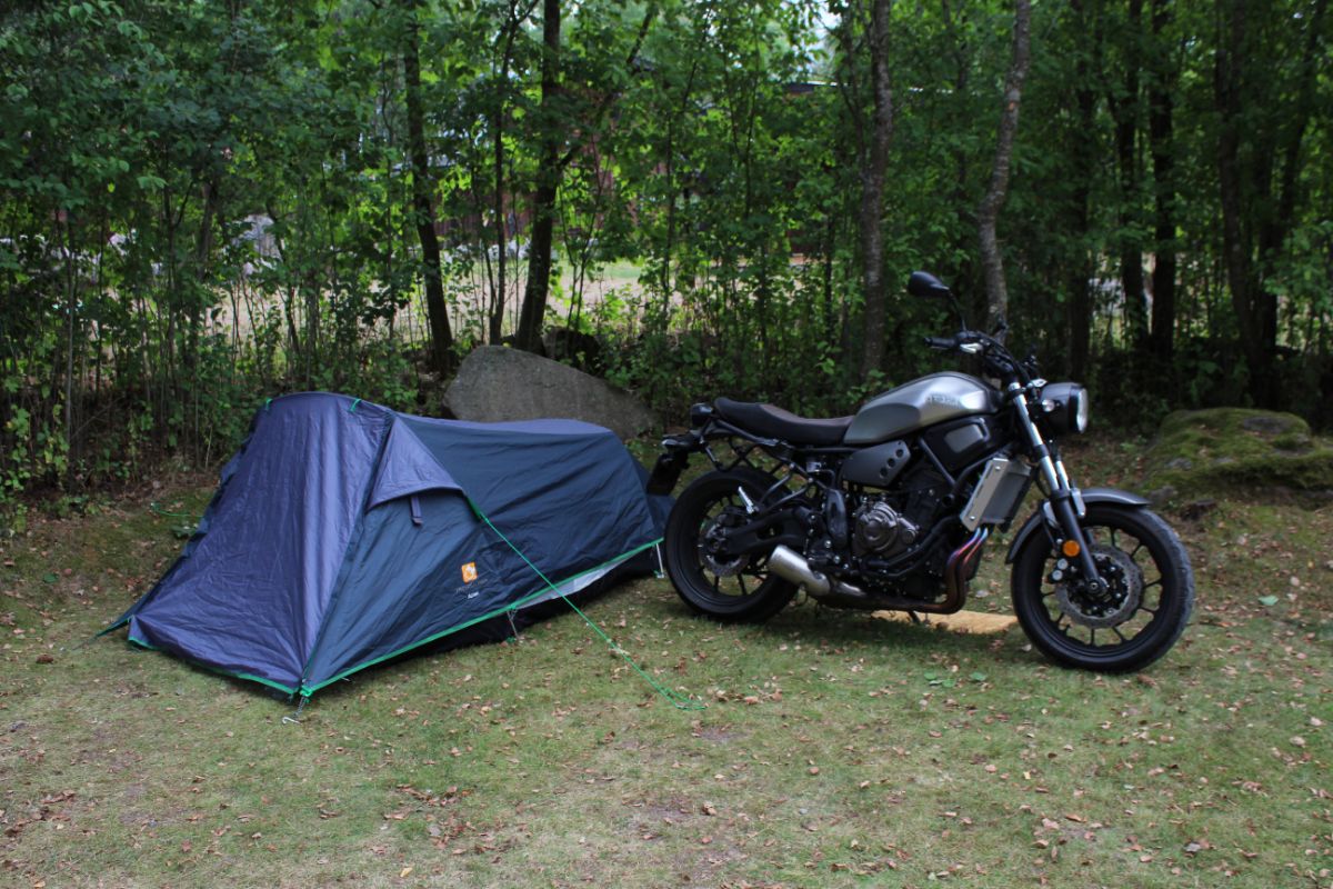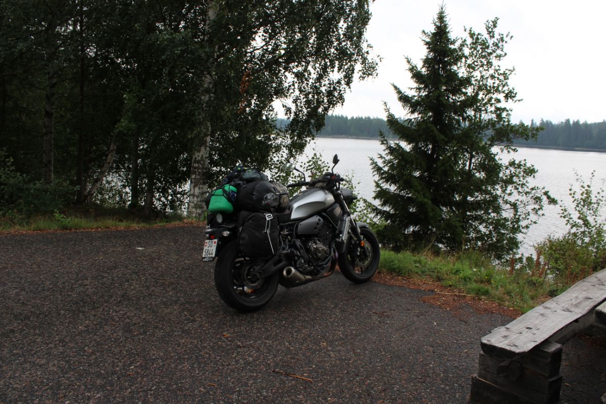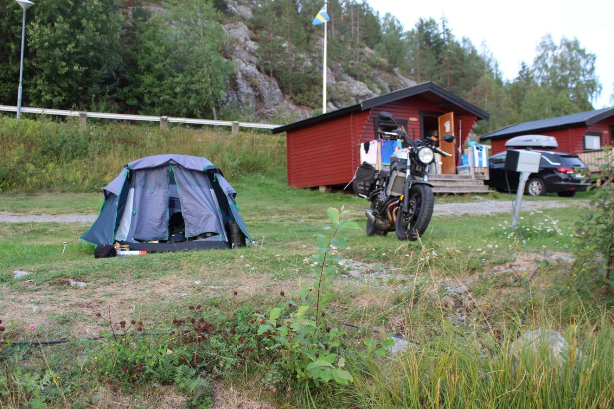 Ich kann mich endlich an kleinenSachen freuen. Zum Beispiel die Spanier die ich mehrmals Kreuze und mich immer mit einem breiten Grinsen überholen und Grüssen. Oder plötzlich war die Strasse offen und ich musste mit Strassenpneus durch nasses grobes Kies und ich bin nicht hingefallen. Das macht einfach freude. An diesemTag regnete es das erste Mal und ich fand keinen Campingplatz mehr, denn in Nordschweden ist es nicht mehr so dicht besiedelt. Also durfte ich das erste Mal Wildcampen, denn hier oben war es genügend nass dachte ich mir. Bei Regen wurde dann das Zelt aufgebaut und gekocht. Als ich mit allem Fertig war, war auch der regen vorüber. Ich hatte wiederum einen Platz an einem See gefunden, einfach unbeschreiblich diese Stimmung in Mitten der Natur, geil. Ich kam an diesem Tag auch das erste Mal mit anderen motorradfahrern ins Gespräch, das macht sehr viel aus wenn man den ganzen Tag alleine auf dem motorrad sitzt.