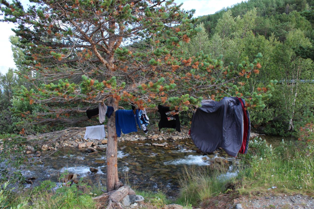 Heute war Wasch und Pausentag. das Wetter bleib den Ganzen tag drocken so konnte ich ohne Probleme meine wäsche waschen und sie nachher an einem Baum aufhängen damit sie im wind trocknen. es windete so stark, ass die Wäsche nach einem halben tag trocken war. Da ich ein gröberes Geschäft vor hatte, suchte ich eine Tankstelle auf. Nach dem Geschäftsabschluss, traf ich draussen einen Schweden der mit einer DR 650 unterwegs war. Er war etwa gleich alt wie ich. Wir tauschten uns etwas aus, er zeigte mir ein paar schöne Routen in Norwegen und meinte dann ich solls noch geniessen, das Wetter werde bald richtig kake. Solche Gespräche sind unglaublich viel wert auch wenn sie nur 10 Minuten dauern, aber so alleine im Nichts, daran muss ich mich noch gewöhnen. Am Nachmittag komme ich endlich dazu, meine Mundharmonika zu spielen. Alle meine Entchen geht schon ganz gut. Eigentlich hab ich mein Zelt an einem ruhigen Ort platziert, aber gleich wohl müssen alle Reisecars an genau diesem Parkplatz ihren verdammten Halt machen, klingt blöd aber ich hasse Massentourismus. So kommt es dass ich den rest vom Nachmittag damit verbringe, dass ich im Fjord entlang spazieren gehe, ist ganz entspannend. das Wetter bleibt trocken aber es windet stark und wird immer bewölkter. In der Nacht regnet es wieder stark.