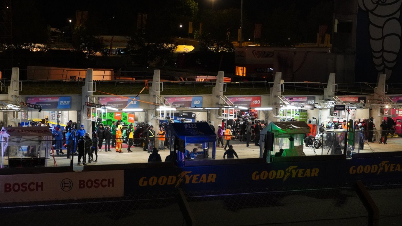 Nach einem weiteren Fotoausflug an die Strecke, es war 22:30, kam ich zurück in die Box und das Motorrad stand da, nicht vor der Box, sondern in der Box. Ich fragte mich durch, keiner konnte mir so richtig sagen, was los ist. Einzig, dass das ganze Bremssystem am Vorderrad ausgewechselt werden musste. Kurz nachdem das Motorrad rausfuhr, erfuhr ich, was los war: Beim Boxenstopp ging das Vorderrad nicht richtig rein, man musste nachhelfen. Als der Fahrer draussen war, hatte er zu wenig bis keinen Bremsdruck und er kam wieder in die Box. Da es zu viel Zeit benötigte, das ganze System zu entlüften, wurde das ganze System ausgewechselt.
