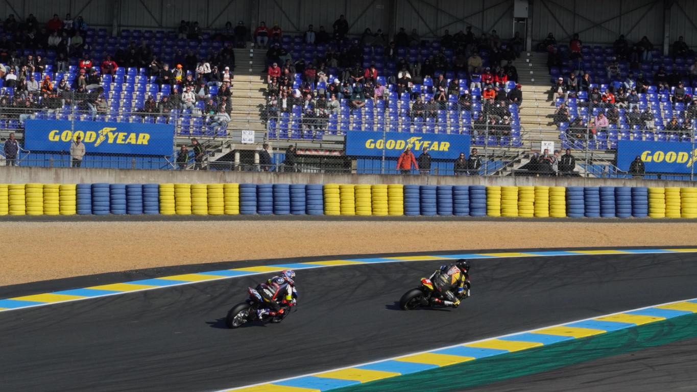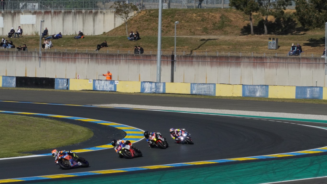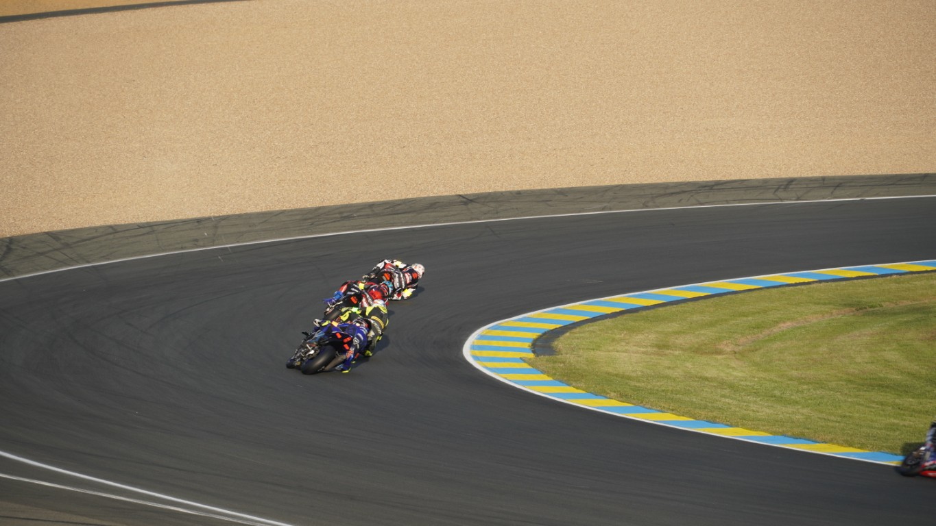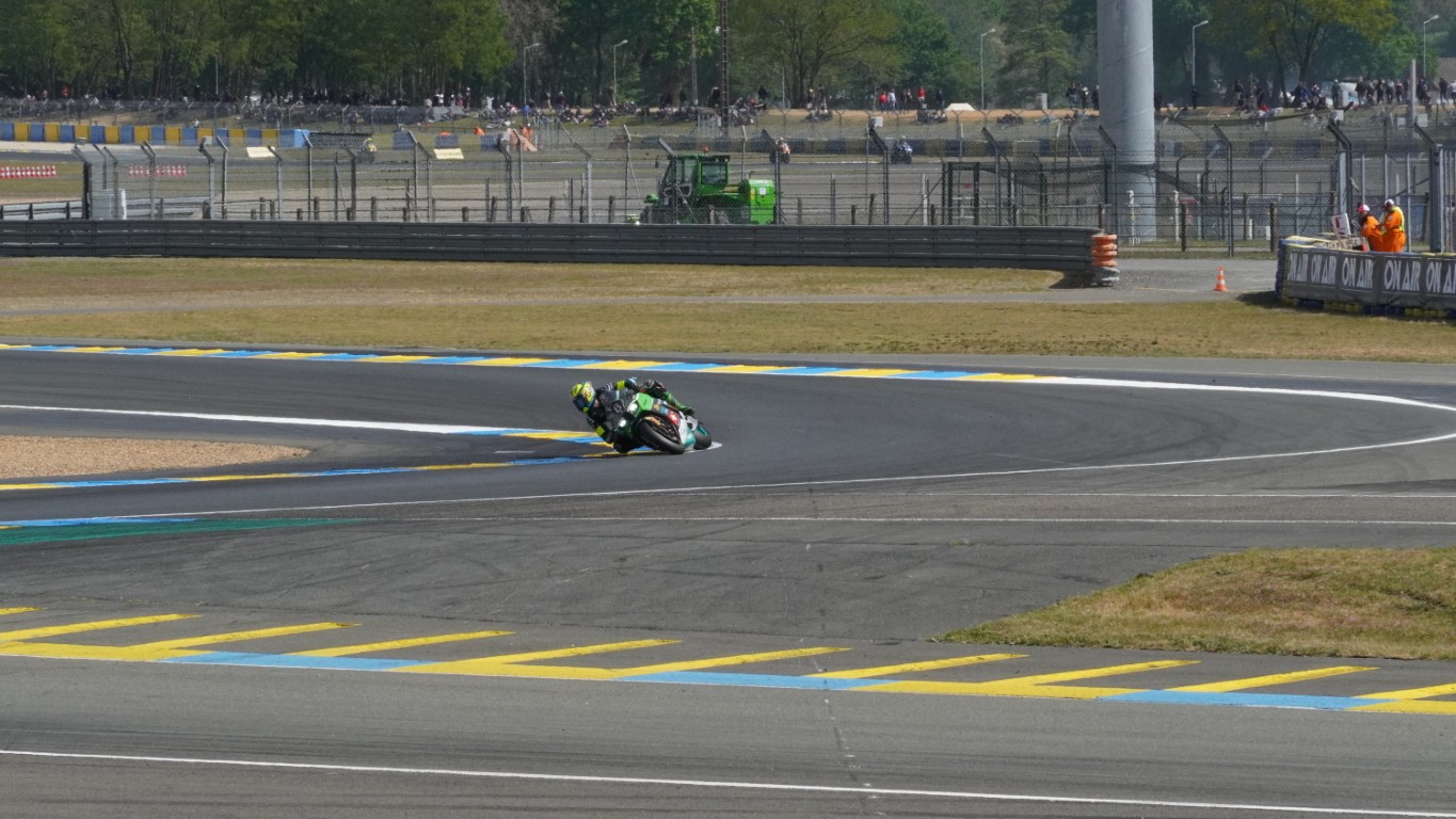 Dann kamen die Securitys und ich musste die Startaufstellung verlassen. Mirko, der Social-Media-Verantwortliche vom Team Bolliger, fragte mich, ob ich mit ihm zur ersten Kurve komme, um den Start anzusehen. Ich freute mich und ging mit. Oben angekommen, genossen wir die französische Nationalhymne, die mit viel Herzblut gesungen wurde und überall auf der Rennstrecke zu hören und zu spüren war. Dann ging es schon los und die 60 Motorräder bretterten an uns vorbei. Eindrücklich, aber leider habe ich den legendären Le-Mans-Start so verpasst. Wir wechselten noch ein paar Mal die Position und machten unsere Aufnahmen. Alex ist der Start geglückt, er fuhr von Startplatz 14 auf 10. Nach 20 Minuten wurden dann schon die ersten überrundet. Ich wollte nicht zu lange draussen an der Strecke bleiben, denn ich wollte beim ersten Fahrerwechsel und Boxenstopp dabei sein.