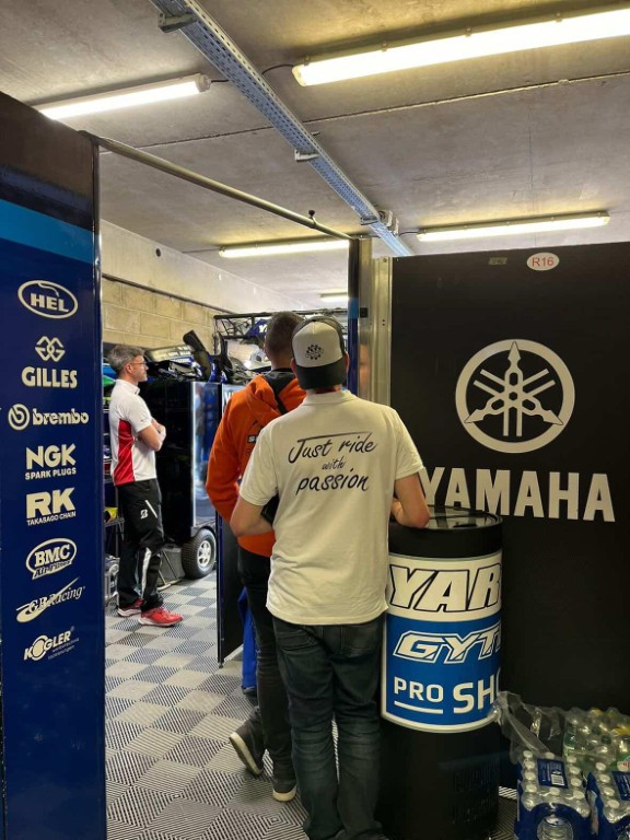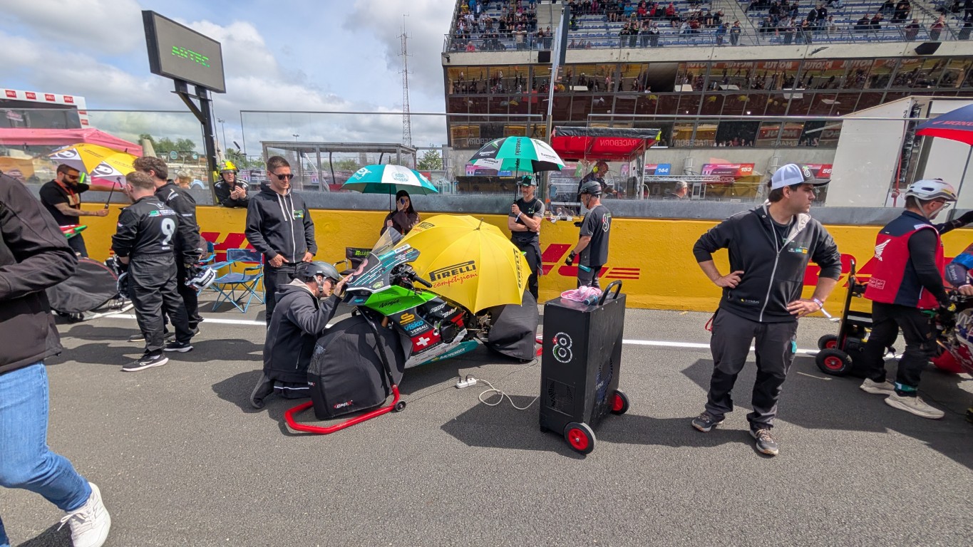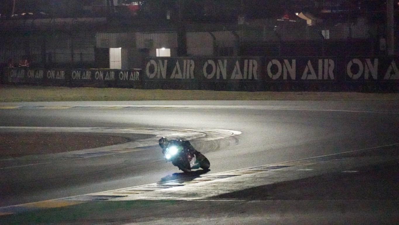 Bis kurz vor 18 Uhr verbrachte ich die Zeit in der Box. Der erste Kaffee wurde verschlungen, wie viele es wohl noch werden? Dann kam Michèle von Kawasaki Schweiz zu mir, wir kennen uns von den vergangenen Kawasaki-Tests. Sie meinte, sie können noch in ein paar andere Boxen reinschauen, ob ich mit wollte. Ich sagte natürlich gleich zu und so zogen wir los. Zuerst gingen wir zu Yart, dem späteren Gewinner des 24-Stunden-Rennens in Le Mans. Eine ganz andere Box als bei Bolliger, aber nicht weniger ordentlich oder organisiert. Es war auch eine Ruhe zu spüren, man merkte, die wissen, was sie machen. Wir warteten den Boxenstopp ab und gingen dann weiter zu Kawasaki Webike Trickstar. Es ist das Kawasaki-Werksteam und das einzige Team, das mit der neuen ZX-10R an den Start ging, was an den Winglets einfach zu erkennen war. Auch diese Box sah wieder ganz anders aus, wenn auch nicht etwas chaotischer. Trotzdem reichte es am Schluss für den dritten Rang. Michèle nahm mich dann noch mit zum Kingtyre Fullgas Racing Team, auch ein Kawasaki-Team. Hier waren wir aber nicht nur wegen dem Einblick in die Box, dazu später. Denn hier sahen wir einen etwas anderen Boxenstopp, das Team hatte kein Schnellwechselteam wie zum Beispiel das Team Bolliger und musste bei jedem Boxenstopp die Kette neu «einfädeln». Und genau das dauerte etwas mehr Zeit.