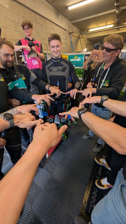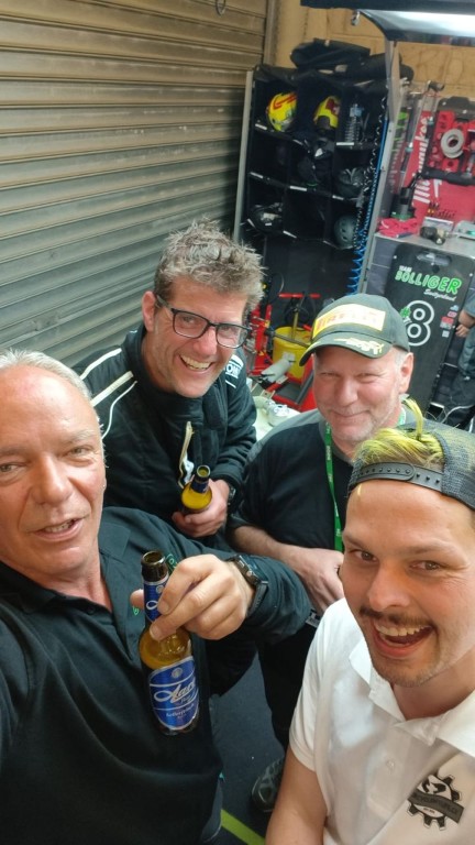 Dann war 15 Uhr und wir rannten alle auf die Boxenmauer, um die Fahrer jubelnd im Ziel zu begrüssen. Freunde, da waren bei mir alle Dämme gebrochen, meine Knie zitterten und die Tränen flossen und ich konnte mich schlecht beruhigen. Es half auch nicht, als sich alle in den Armen lagen. Wir waren auf dem gesamten 7. und in unserer Klasse auf dem 6. Rang ins Ziel gefahren. Das bedeutet 30 Runden hinter dem Gewinner Yart, 829 gefahrene Runden und 27 Pitstopps, die gesamthaft 51 Minuten und 15 Sekunden dauerten. Das Ergebnis war aber in diesem Moment Nebensache, wir freuten uns einfach, dass wir es geschafft hatten. Die Motorräder kamen nach der Auslaufrunde zurück in die Box und es gab den einen oder anderen Burnout. In der vergangenen Woche fragte ich mich immer wieder: Wieso macht man diesen ganzen Aufwand? Bei der Zieleinfahrt wurde es mir zum wiederholten Male bewusst, wieso. Als ich mich etwas beruhigte, ging ich in die Box, da umarmte man sich und stiess mit Aarebier an und es gab wie so oft einen Schnupf, aber dieser war ganz besonders. Bald merkte ich, ich war nicht der Einzige, der Tränen in den Augen hatte. Auch Lüschi war sichtlich gerührt und meinte gutmütig: «Weisch Luki, das muäsch eiifach usä laah, das isch doch öbis schöns».