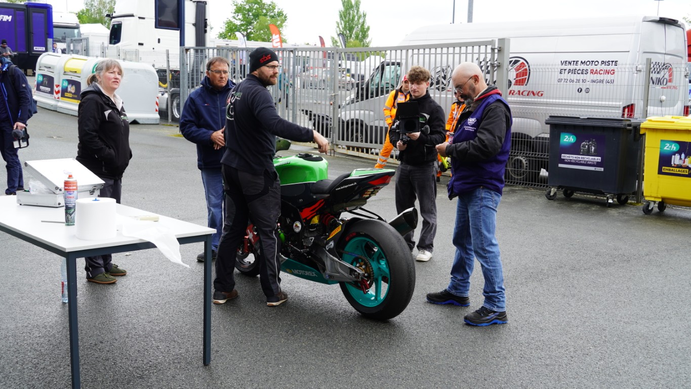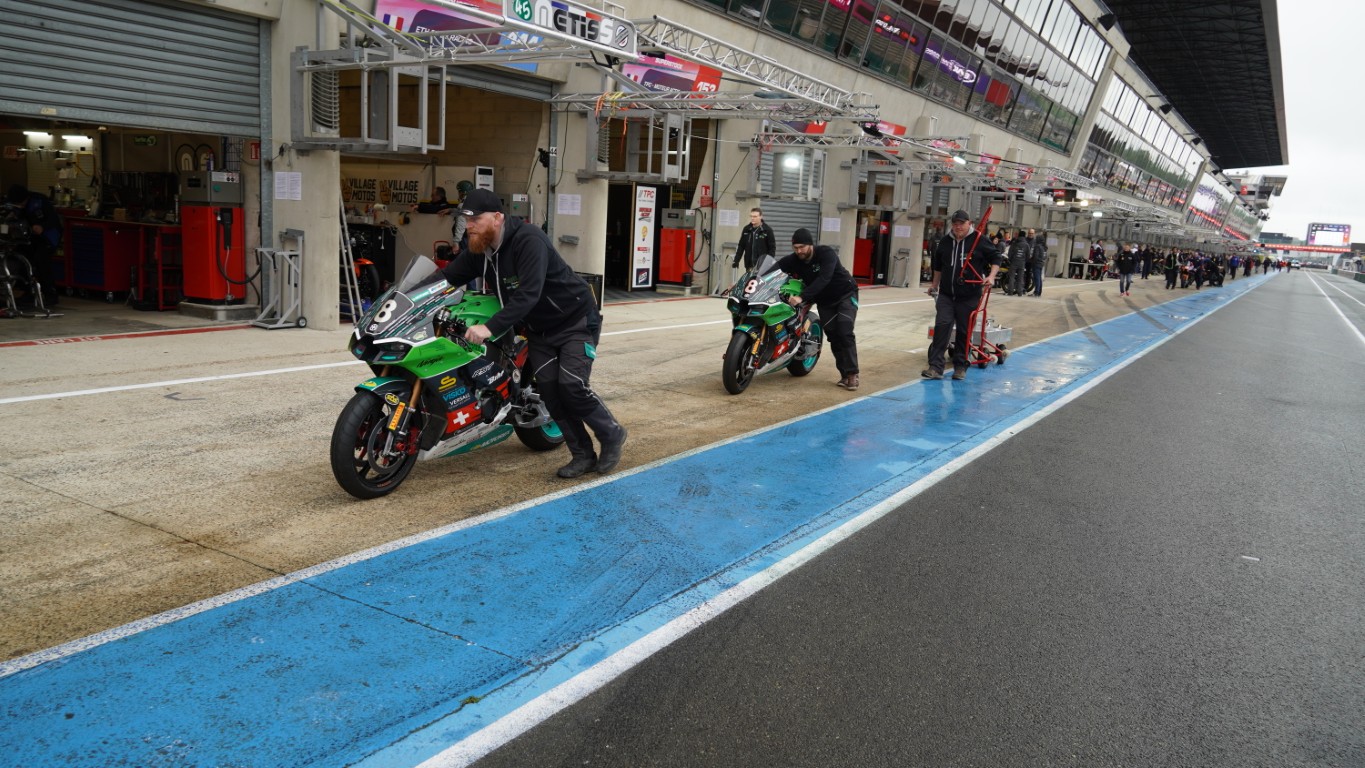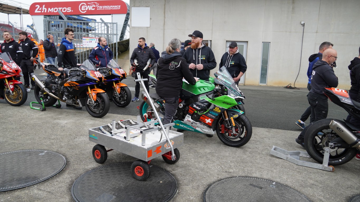Ich nutze den Morgen, um ein Video zu schneiden. Es dauert nicht lange, bis Kevin mich ruft – die technische Abnahme steht an. Die Prüfer kommen in die Box, um die Motorräder zu inspizieren. Danach geht es in die Technical Bay (Parc fermé) – nicht zu verwechseln mit Baywatch – für die Lautstärkenmessung und das Wägen. Bei der Lärmmessung dürfen bei 5500 Umdrehungen die 105 dB nicht überschritten werden. Nach dem Rennen darf das Motorrad 3 dB lauter sein. Jeder Auspuff, auch die als Ersatz mit dabei sind, müssen geprüft werden. Das minimale Gewicht wird ebenfalls nicht unterschritten, und so ist alles in Ordnung. Sie bekommen einen Kleber mit einer Prüfnummer. Nun dürfen theoretisch beide Motorräder an den Start. Es ist jedoch bereits klar, welches Motorrad am Samstag eingesetzt wird. Das andere muss innerhalb der ersten Runde des Rennens ausserhalb der Box sein. Dort wird es dann auch gleich von Fäbu und Küsu auseinandergenommen, denn dieses Motorrad dient ab diesem Zeitpunkt als Ersatzteillager.