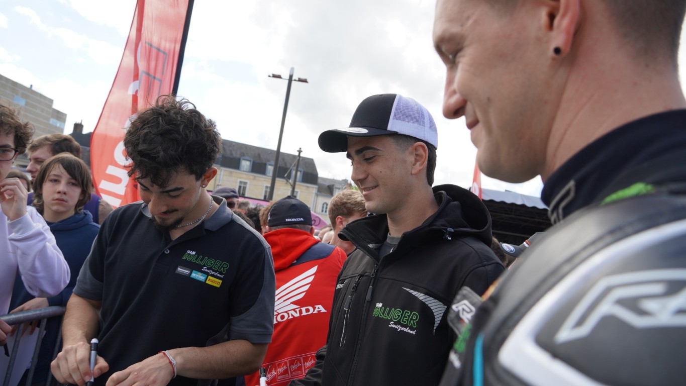 Schon von Weitem ist das Brummen der Motoren zu hören, und dann sind sie da: die 60 Motorräder, begleitet von der Polizei. Dann beginnt die Suche nach unserem Motorrad. Es hat so viele Leute, und alle wollen zu den Fahrern – ich auch. Irgendwann finde ich den Eingang und das Team Bolliger. Die Jungs sind schon fleissig am Unterschreiben, und der Rest des Teams geniesst die Sonne. Für die Fans ist das Ganze ein Highlith. Auch für mich ich stand in schlagnähe zu van der MArk oder Reitenberger, die ich aus der WSBK kenne.