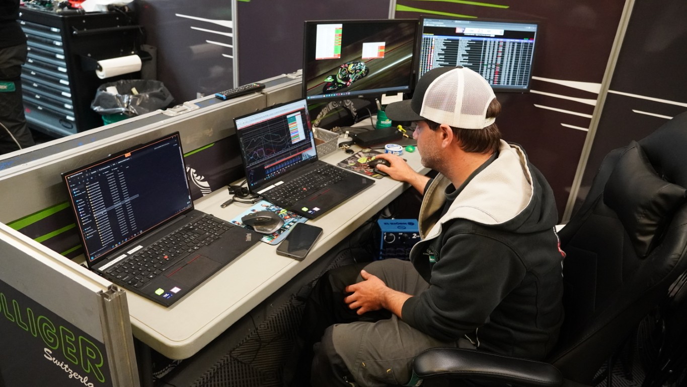Während dem Nachttraining gehe ich noch bei Marco vorbei. Marco sitzt vor zwei Bildschirmen, auf einem sind ganz viele wirre Diagrammlinien zu sehen, sie stellen Messwerte dar, wie ich später erfahre. Er ist für alles zuständig, was Performance angeht, das heisst Elektronik, Fahrwerk oder die Reifen fallen in seine Verantwortung. Er fällt anhand von ca. 40 zusätzlich verbauten Sensoren, was am Motorrad geändert oder optimiert werden muss. Und dann ist es schon soweit, Alex kommt zurück in die Box und das Nachttraining ist zu Ende. Jetzt gibt’s noch ein «Plättli» zum Tagesabschluss. Ich freue mich auf morgen!