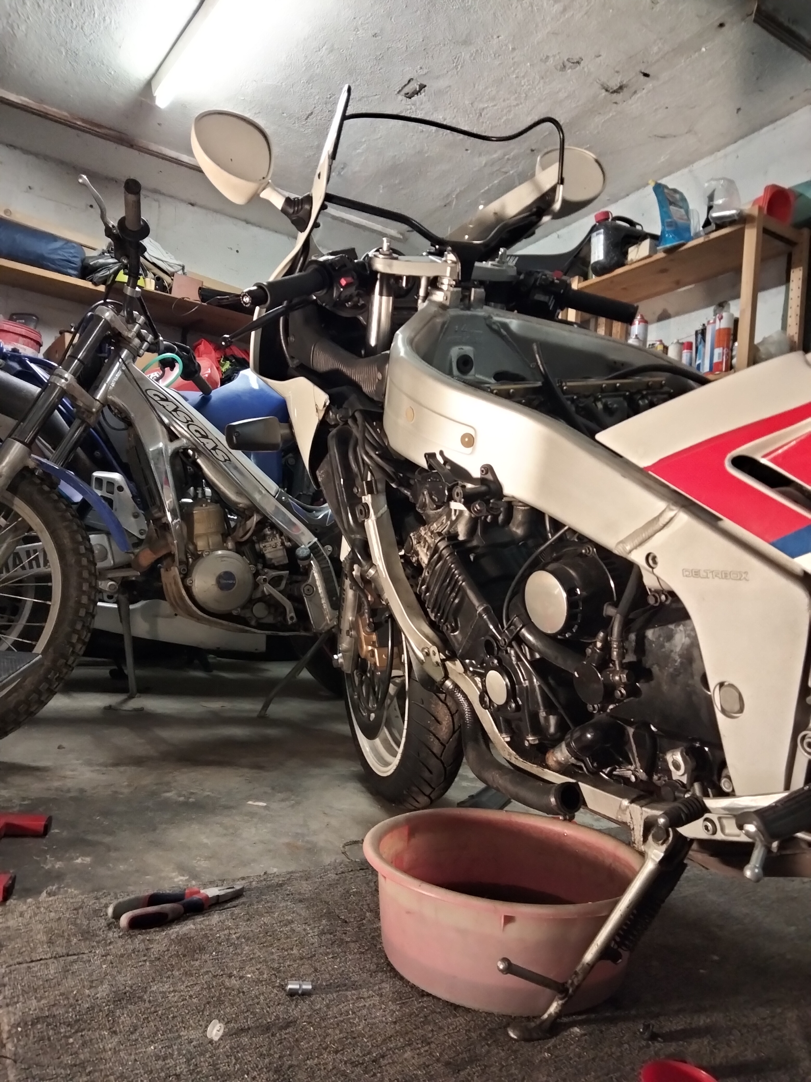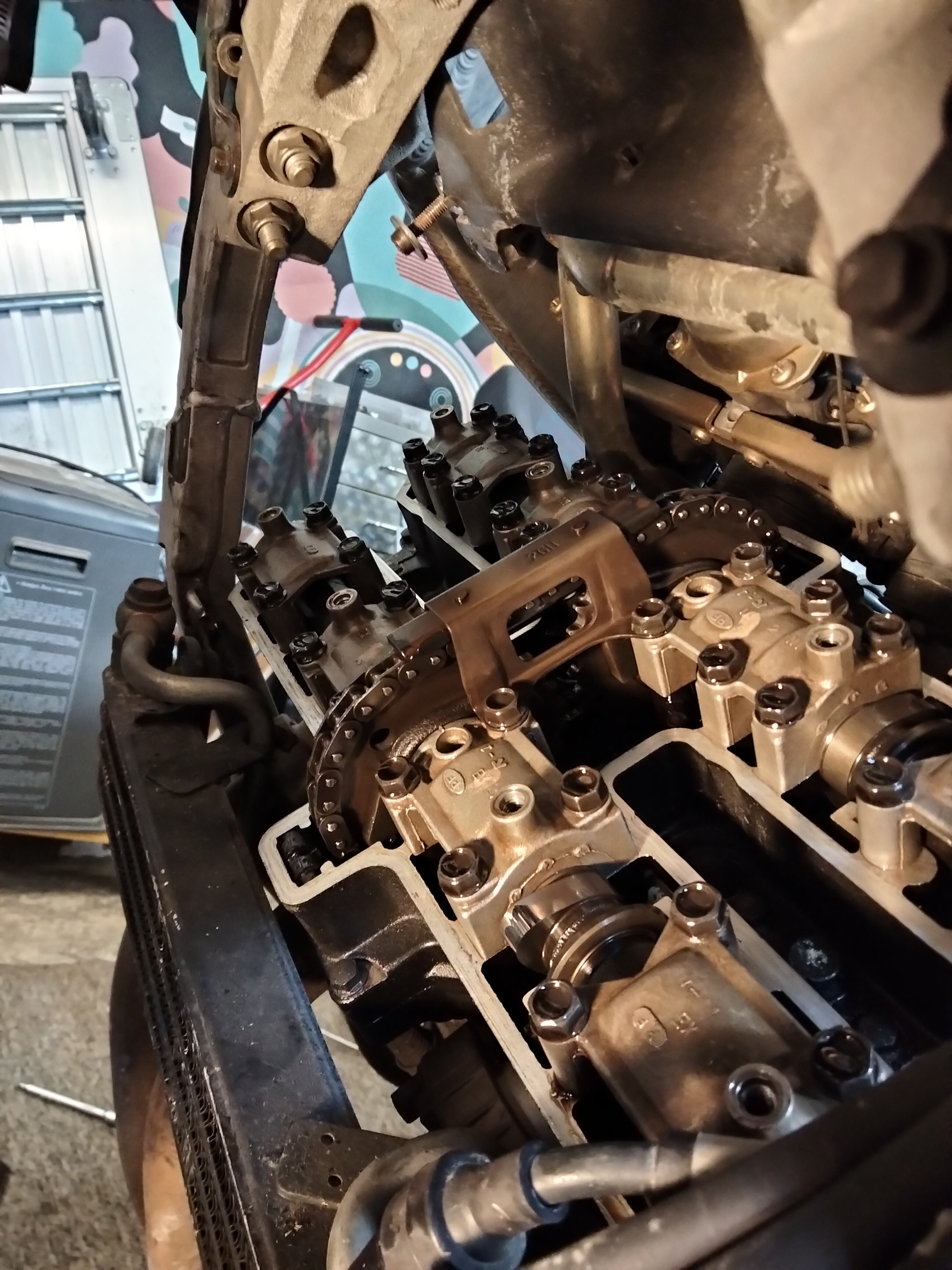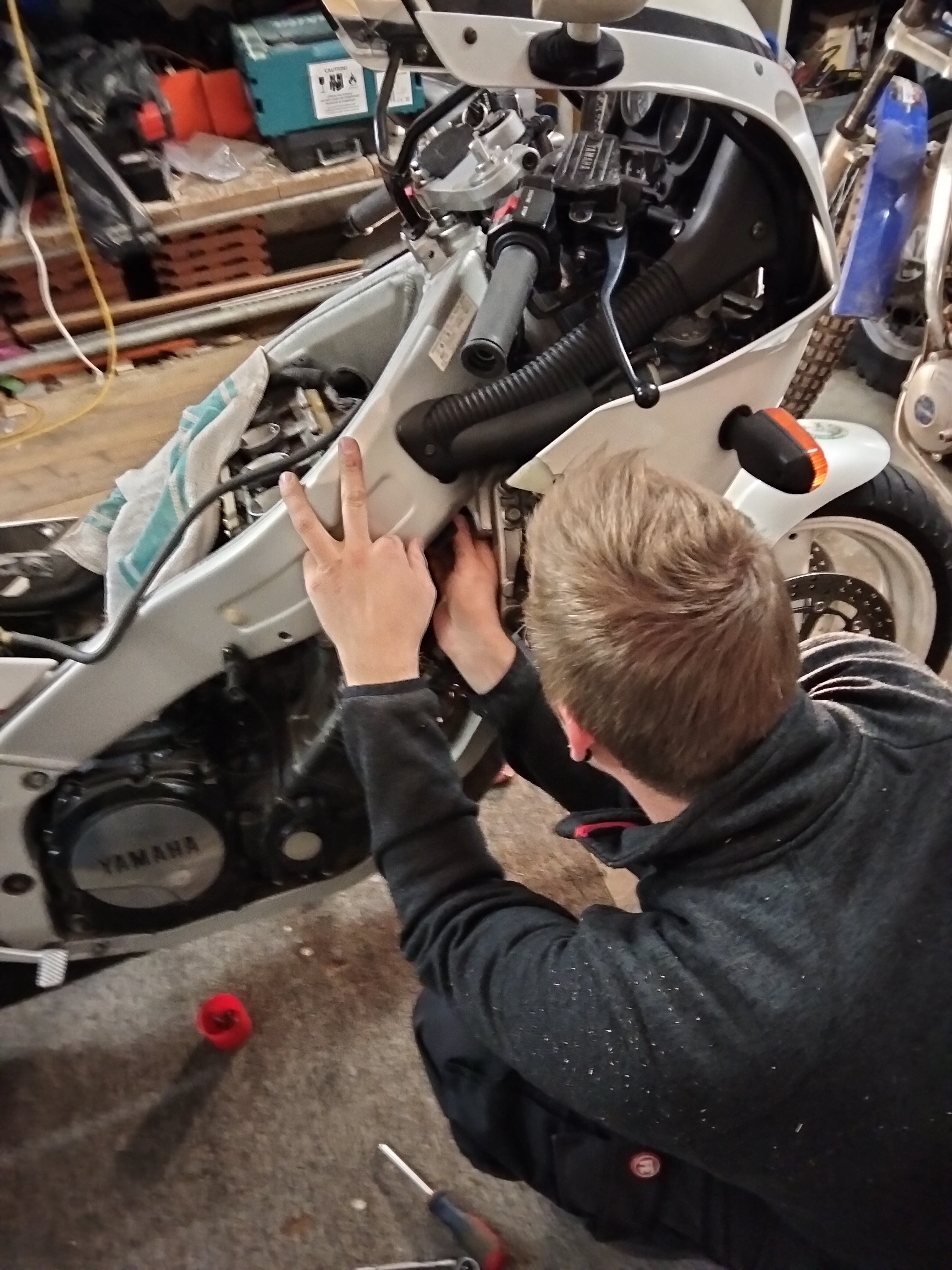Wenn man genau hinsieht merkt man es, die FZR ist nicht mehr die jüngste. Und so sammelte sich Öl unter dem Motorrad. Ich hab ja damit gerechnet das sowas noch kommt, es hat mich dann gleichwohl angekackt. Also musste die ganze Verschalung runter um die inkontinente Stelle zu finden. Es war die Dichtung des Zylinderkopfdeckels.