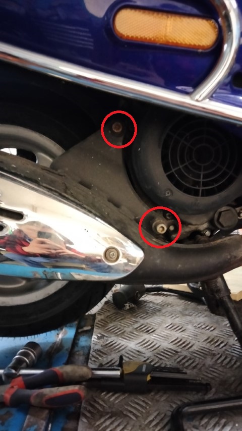 3.Auspuff demontieren: Dazu muss vorne unter dem Sitz eine Abdeckung demonitert werden. Durch diese Öffnung und von unten kann man dann die beiden Krümmerschrauben lösen. Dann müssen noch zwei Schrauben am Endtopf entfernt werden und man hat den Auspuff in der Hand.