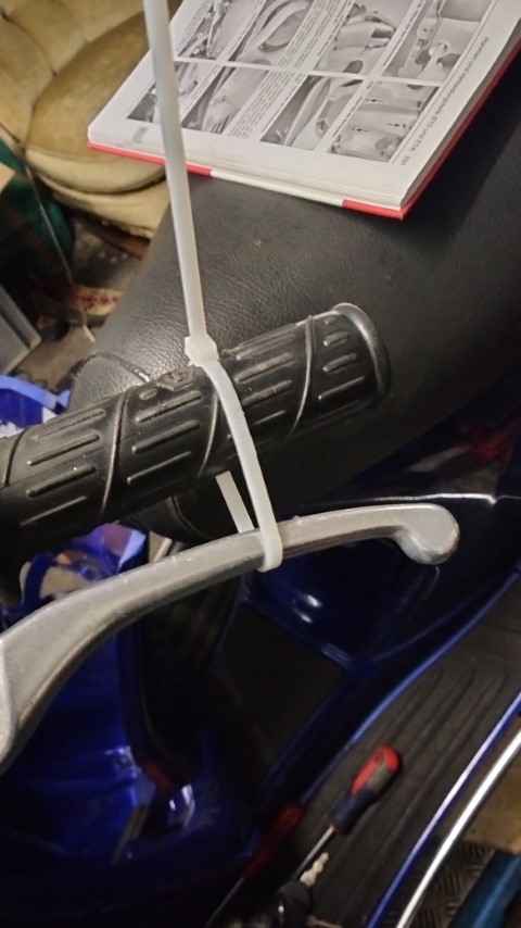 4.Bremse fixieren: Damit das Hinterrad sich nicht bewegt während die Achsschraube gelöst wird, muss man die Hinterradbremse blockieren. Dies ist beim Roller vorne rechts. Hat man ein Kollege gerade zur Hand, so kann der die Bremse ziehen. Hat man keinen Kollegen zur Hand, kann ein Kabelbinder sehr gut helfen.
