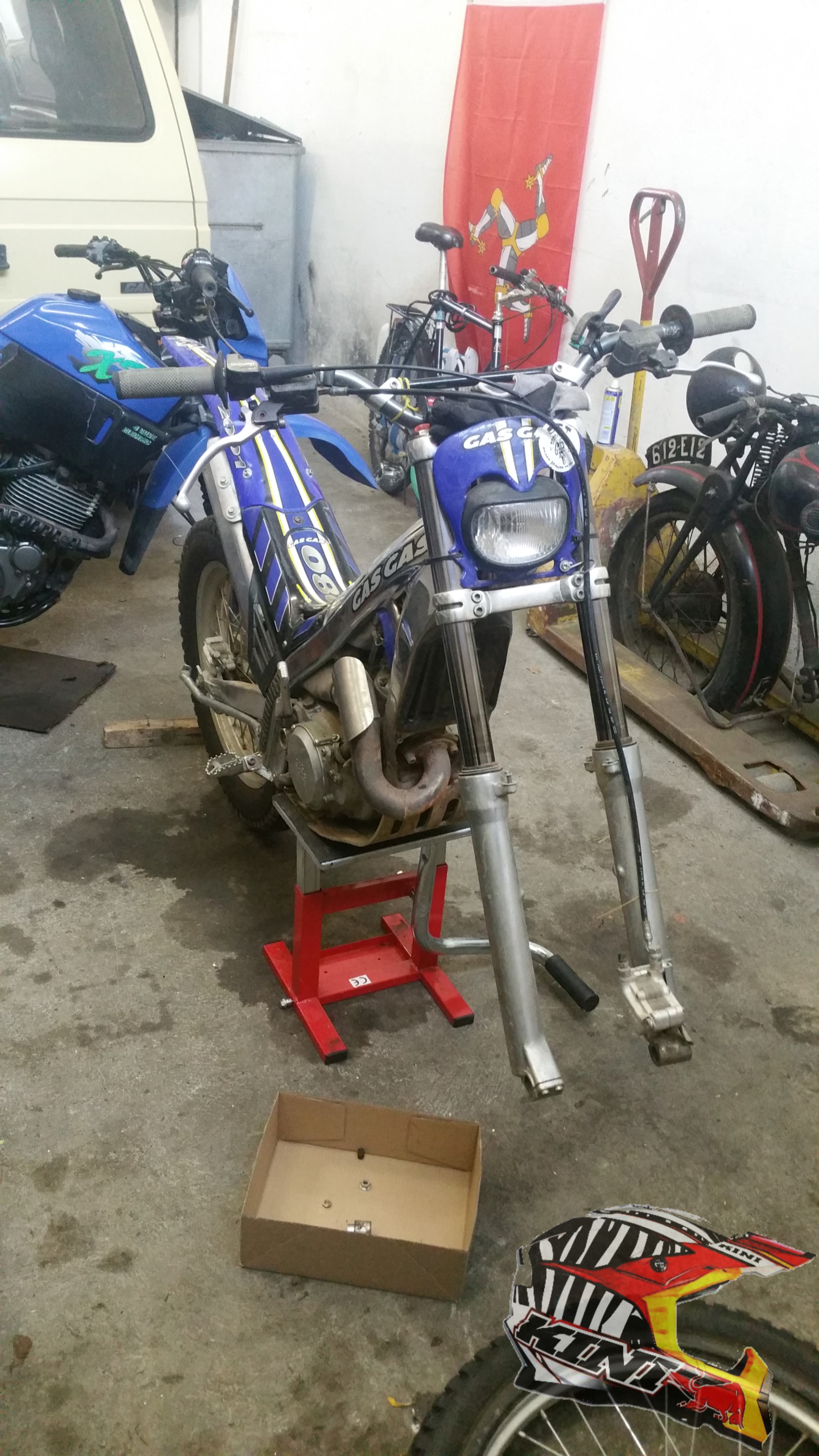 Im Frühling ging es dann zum ersten und leider auch letzten Trialtraining in diesem Jahr. Ich verbrachte viel Zeit auf dem Parcourteil. Es gab aber auf der Endurostrecke einen Teil denn ich unbedingt noch hinunter fahren wollte. Als die Enduros alle Feierabend gemacht hatten, begab ich mich zu diesem Hang. Leider erwischte ich anstelle des ersten Ganges den Neutral und raste direkt in den Dornenbusch. Und was hat dies nun mit dem Jahresrückblich in der Garage zu tun? Beim Sturz hat leider das Motorrad auch gelitten, das Vorderrad verlor Luft. Gut ich dachte das kann keine Sache sein und ich kann das selber. Beim ersten Versuch hantierte ich natürlich nicht mit dem richtigen Werkzeug sondern mit Schraubenzieher. Als das Loch geflickt war und ich den Schlauch wieder montiert habe, hatte der Schlauch natürlich an einem neuen Ort ein Loch, dank meinem professionellen Werkzeug. Also ging ich auf die Louis Seite und bestellte mir zwei Montiereisen. Beim zweiten Versuch klappte es dann wunderbar. Die Montiereisen kosten übrigens nur 10 Euro.