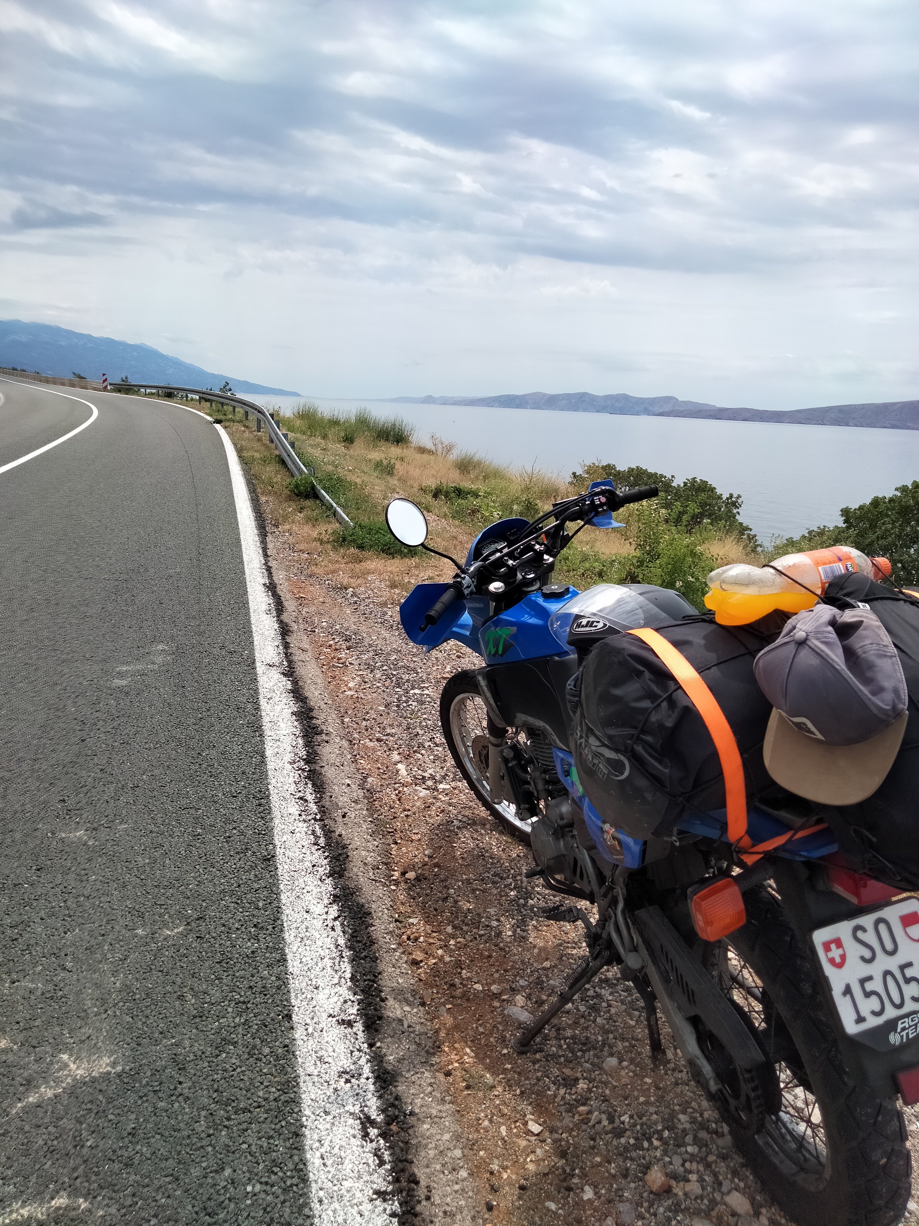 Auf diesem Camping, es hiess übrigens Ujca, gab es natürlich auch ein kleines Restaurant. Dort sass ich mich dann am Abend hin und schrieb diese Zeilen in mein Tagebuch. Während ich da so schrieb, etwas ass und ein kroatisches Bier genoss, fing es an zu regnen und alle Gäste mussten unter das kleine Vordach. Wir verteilten uns an die wenigen Tische und ich sass zu einem jungen Paar, dass überraschenderweise aus der Ostschweiz kam. Sie waren in meinem alter und wir kamen ins Gespräch. Es ist schön auf einer solchen Reise Menschen zu treffen die die selbe Motivation haben und ihre interessanten Geschichten zu hören. Die zwei waren mit einem Dacia und einem Dachzelt unterwegs und es war ihr letzter Tag bevor sie wieder nach Hause fuhren. Irgendwann ging es dann doch ins Zelt und ich legte mich hin. Das Wetter wurde nicht besser. Und da zeigte sich auch der einzige Nachteil dieses Campingplatzes, der Boden war sehr steinig und ich konnte das Zelt nicht richtig im Boden fest machen. Es begann richtig fest zu regnen und der Wind wurde auch immer stärker. Der Regen kam gefühlt von unten und es wurde ungemütlich im Zelt. Draussen sah ich die Lichtkegel der Taschenlampen von den anderen Campern die nochmals alles wegräumten und festzurren. Ich war zu müde für Stress und legte mich in die Zeltmitte wo es noch trocken war. Am nächsten Tag, sah man am Innenzelt was es bedeutet wenn es von unten regnet, es war bis 30cm vom Boden weg braun. Beim zusammenpacken freute ich mich dass ich meine alte XT dabei hatte, es kamen immer wieder Familienväter, die erzählten dass sie auch mal so ein Motorrad hatten. Dass es eine XT und keine DT ist und dass sie 600ccm und nicht 125ccm hat ist ein Detail, Hauptsache ich kam mit Menschen ins Gespräch. Was mich bei diesen Gesprächen jeweils beunruhigt ist, dass alle ihre Motorräder verkauft hatten weil sie Kinder bekommen haben.