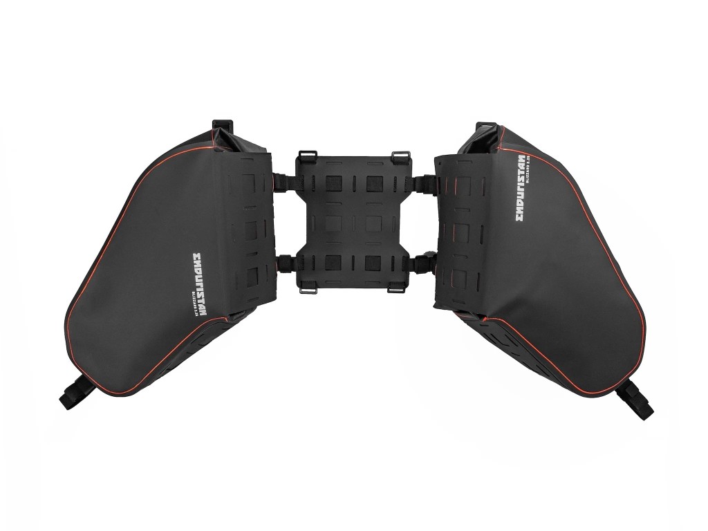 Wir haben einen neuen Aussenstoff. Ich behaupte dies ist der robusteste Stoff, der in unserer Branche im Moment eingesetzt wird. Wir haben dies auf unseren Abriebprüfstand getestet, mit unseren Stoffen und diesen von Mitbewerbern, und unser Material hält 23% länger, wie das Material des besten Mitbewerbers. Dazu kommt beim Blizzard 2 ein neues System, bei dem man Aussentaschen montieren kann. Wir stellten fest, dass die Kunden gerne aussen kleine Taschen haben, wo sie schnell drankommen können. Es können auch Benzinflaschen montiert werden, damit diese nicht innen beim Essen sind. Schlussendlich haben wir ein System entwickelt, bei dem der Riemen, den man unten am Fussraster montiert, bei einem Sturz abreisen kann, ohne dass die Tasche beschädigt wird. Wir dachten immer der Blizzard 1 ist zu wenig robust, weil er immer an dieser Stelle zerriss. Wir massen dies dann auf einem Prüfstand nach und kamen zum Ergebnis, dass die Stelle bei 210 kg riss. Was nicht wenig ist. Nachdem wir verschiedene Arten, mit anschrauben oder annähen, ausprobiert hatten, um den Riemen zu befestigen, dachten wir uns wir machen ein System, das abreisen kann. Es zerreisst nicht mehr die Taschen, sondern nur noch ein Teil der Schnalle. Du hast dann ein Ersatzteil mit dabei, dass du ganz einfach austauschen kannst. So ist der Riemen in kurzer Zeit wieder montiert. Das geht keine Minute und wir merken auch, dass das die Leute cool finden. Ich denke das ist wirklich ein neuer Ansatz, um das Problem zu lösen. Wir haben einen anderen Mitbewerber, der sagt, wenn du stürzt, geben wir dir eine neue Tasche. Das ist eigentlich ein mega cooles Versprechen, nur hilft es dir nichts, wenn du irgendwo in Afrika im Busch einen Sturz hast und die Tasche kaputt ist. Bei uns fädelt man den Riemen ein, montiert das Ersatzteil und man kann weiterfahren.