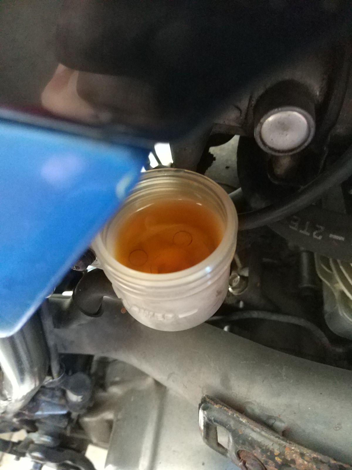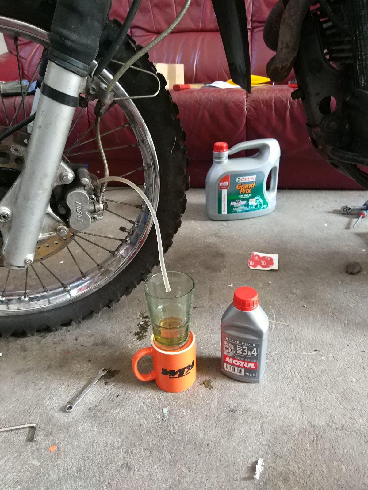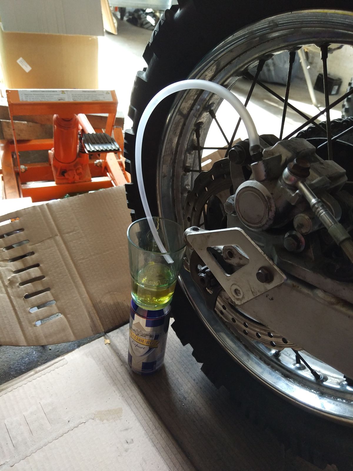 Danach ging es an s entlüften. Dazu braucht es einen Behälter, einen Schlauch und ein Schraubenschlüssel um die Entlüftungsschraube lösen zu können. Mein Schlauch war leider etwas zu kurz deshalb musste ich den Behälter etwas erhöht platzieren. Wenn der Schlauch und der Behälter bereit sind, wird der Bremsflüssigkeitsbehälter geöffnet. Während dem Entlüftungsvorgang ist darauf zu achten, dass der Bremsflüssigkeitsbehälter immer Bremsflüssigkeit hat. Wenn dies mal nicht der Fall wäre würde Luft in das System kommen. Zum entlüften muss einfach an der Bremsbacke die Entlüftugnsschraube aufgedreht werden. Damit die Bremsflüssigkeit auch zirkuliert, muss man die Bremse betätigen und wieder loslassen, betätigen und wieder loslassen, betätigen und wieder loslassen, und so weiter. Dies macht man solange bis man im Schlauch keine Luftblattern sieht und saubere Bremsflüssigkeit aus der Entlüftungsschraube fliesst. Die Bremsflüssigkeit ist sehr agressiv, dass heisst falls man es aus versehen verschüttet, sofort weg wischen. Ansonsten habt ihr Rost am Motorrad oder Löcher in den Klamotten.