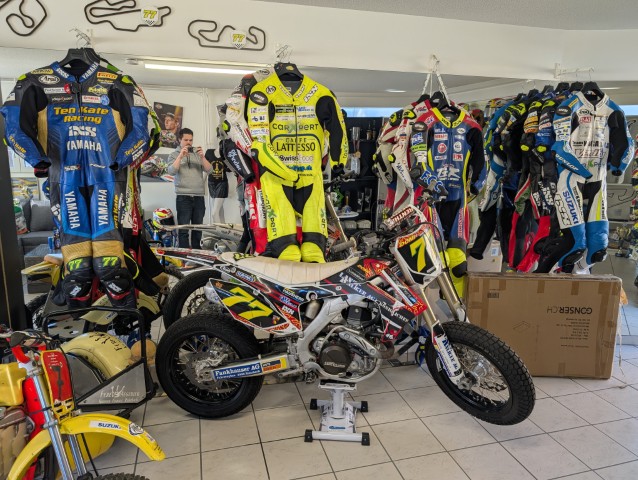 Ja es ist sicher eine riesen Ehre dort teilnehmen zu dürfen. Eingeladen wurde ich schon zum dritten Mal. Ich denke die das hier lesen kennen alle Valentino Rossi. Es wurden 46 Fahrer aus der ganzen Welt eingeladen und ich als kleiner Schweizer. Dort dabei zu sein ist sicher etwas ganz spezielles. Valentino Rossi baute in Tavullia in Italien eine Trainingsstrecke. Diese ist geteert und darauf liegt Sand. Darauf fährt man Crossmaschienen mit speziellen Reifen. Über die Ganze Strecke wird dann getrifftet und versuch natürlich möglichst schnell zu sein. Das nennt sich Flattrack. Es gibt ein Americano Race, am Freitagabend. Dabei starten alle 46 und immer die letzten drei Scheiden aus, dort wurde ich 18.. Im 100km Rennen fährt man zu zweit, mein Teamkollege war Tito Rabat, ein Spanier der auch ind er SUperbike fährt. Alle fünf Runden wird gewechselt was zu etwas Action im Pitline führt. Dort wurden wir 7.