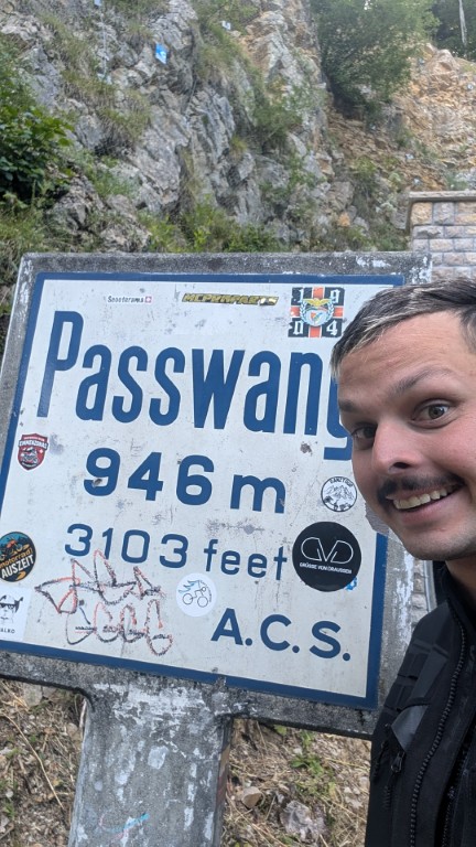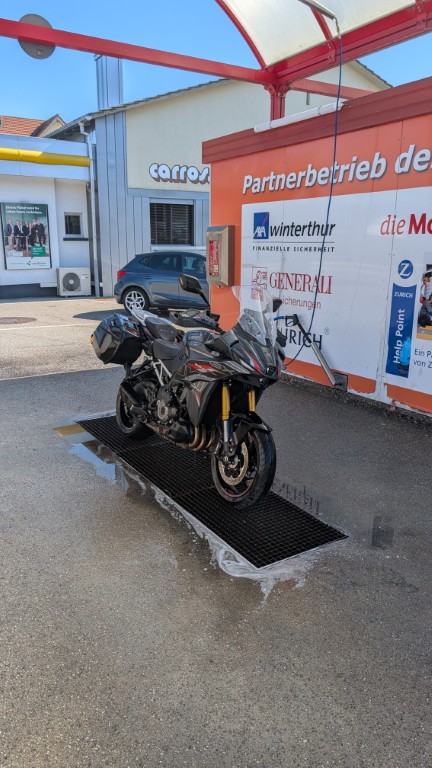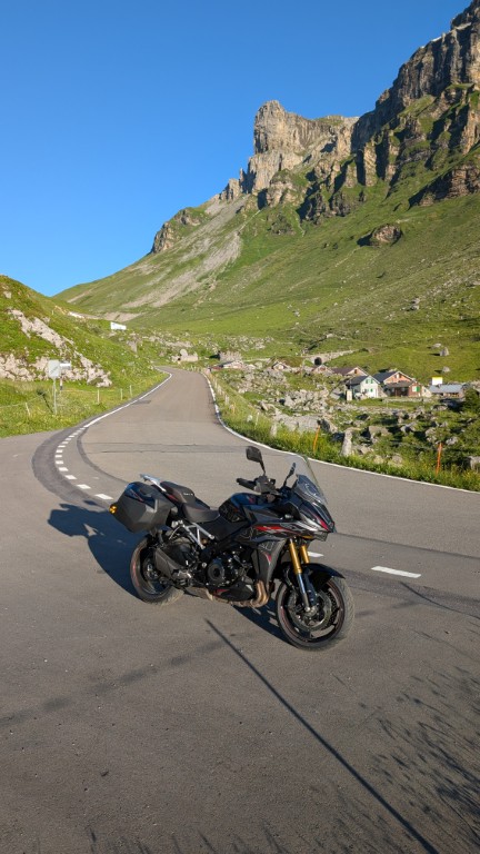 Kurz nach halb fünf Uhr morgens startete die Tour. Mein erstes Ziel war der Klausenpass. Bis nach Altdorf fuhr ich auf der Autobahn. Es war noch kühl, und ich war dankbar für die Griffheizung der Suzuki GSX S1000 GX. Der Tempomat bewahrte mich vor unnötigen Bussen. Im Kanton Uri konnte ich die Autobahn verlassen. Nachdem ich ein paar Bauern mit ihren Milchtanks überholt hatte, gehörte die Straße mir, und ich konnte sie in vollen Zügen genießen. Oben auf dem Pass angekommen, gab es das erste Pass-Selfie mit dem Schild der Passhöhe. Leider war das Restaurant noch geschlossen, also fuhr ich ohne einen erfrischenden Kaffee weiter. Nun ging es hinunter ins Glarnerland, denn der nächste Pass sollte der Flüelapass sein. Doch zuvor legte ich einen kurzen Zwischenstopp an einer Tankstelle ein – ich brauchte dringend einen Kaffee.