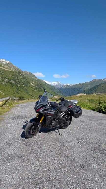 Am Flüelapass begegnete ich den ersten Motorradfahrern und freute mich auf den kommenden Tag. Man könnte nun meinen, dass ich die Griffheizung inzwischen ausgeschaltet hätte – falsch gedacht. Auf dem Flüelapass lag noch etwas Schnee, und es hatte nur etwa fünf Grad Celsius. Oben angekommen trank ich kurz etwas und fuhr weiter.