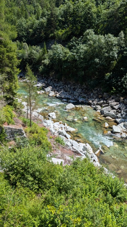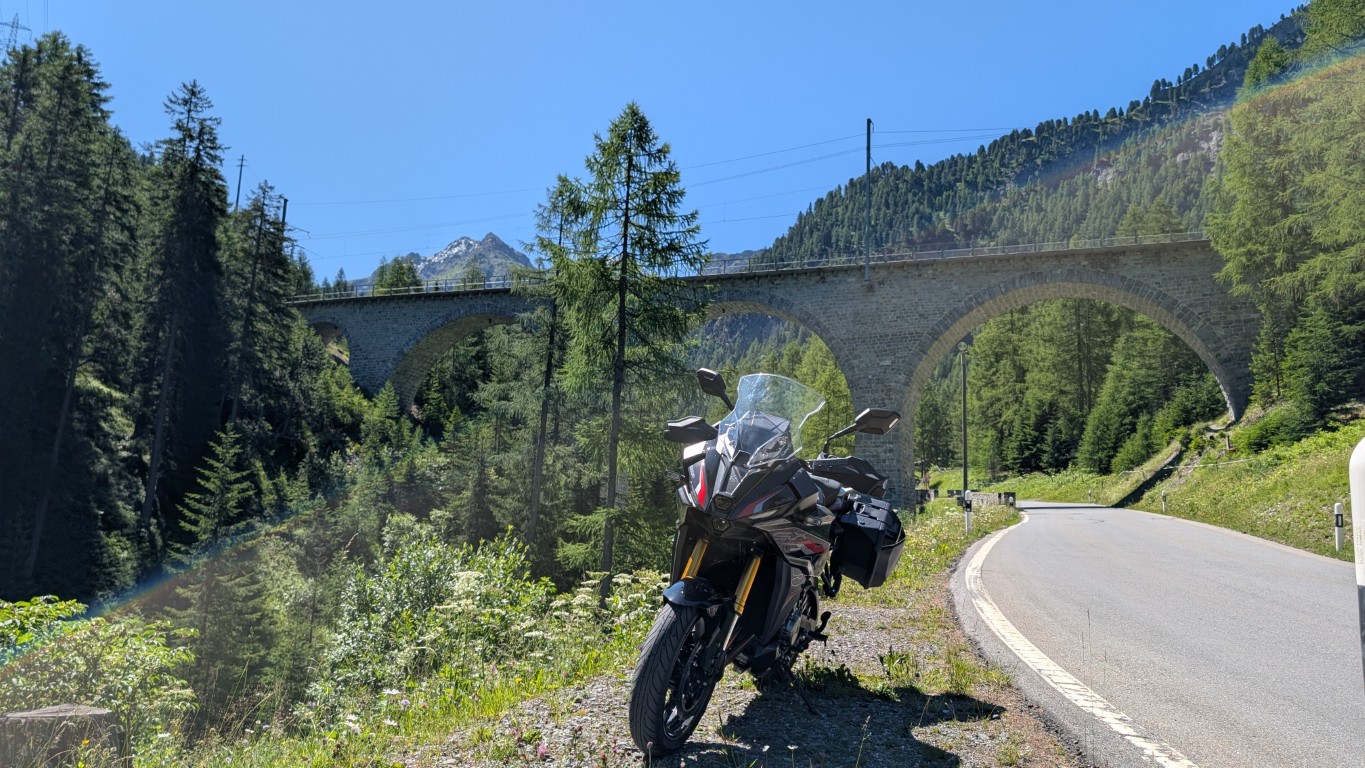 Vom Flüela ging es weiter zum Albulapass – ein Pass mit einer engen Straße. Am Anfang wies ein Schild darauf hin, dass das Fahrzeug nicht breiter als 2,10 Meter sein sollte. Prompt kam mir nach ein paar Metern ein riesiges Wohnmobil entgegen. Doch das war noch nicht alles: Fast oben angekommen sah ich Menschen auf der Straße – mehrere nebeneinander, auf seltsamen Rollschuhen. Sie nahmen mit ihren Stöcken viel Platz ein. Oben angekommen entdeckte ich das Begleitfahrzeug. Es handelte sich offenbar um einen Langlaufclub im Sommertraining – auf der normalen Straße. Großartig! Noch immer war es frisch mit zehn Grad, aber perfekt zum Motorrad- und offensichtlich auch Rollschuhfahren.