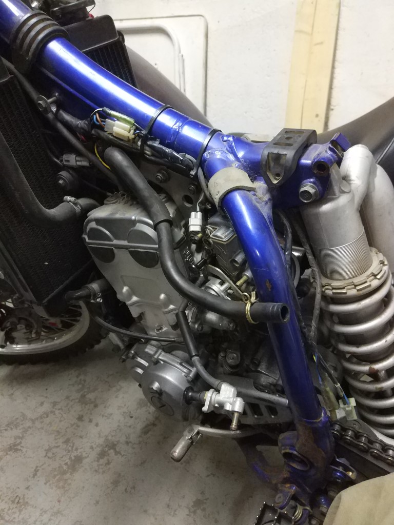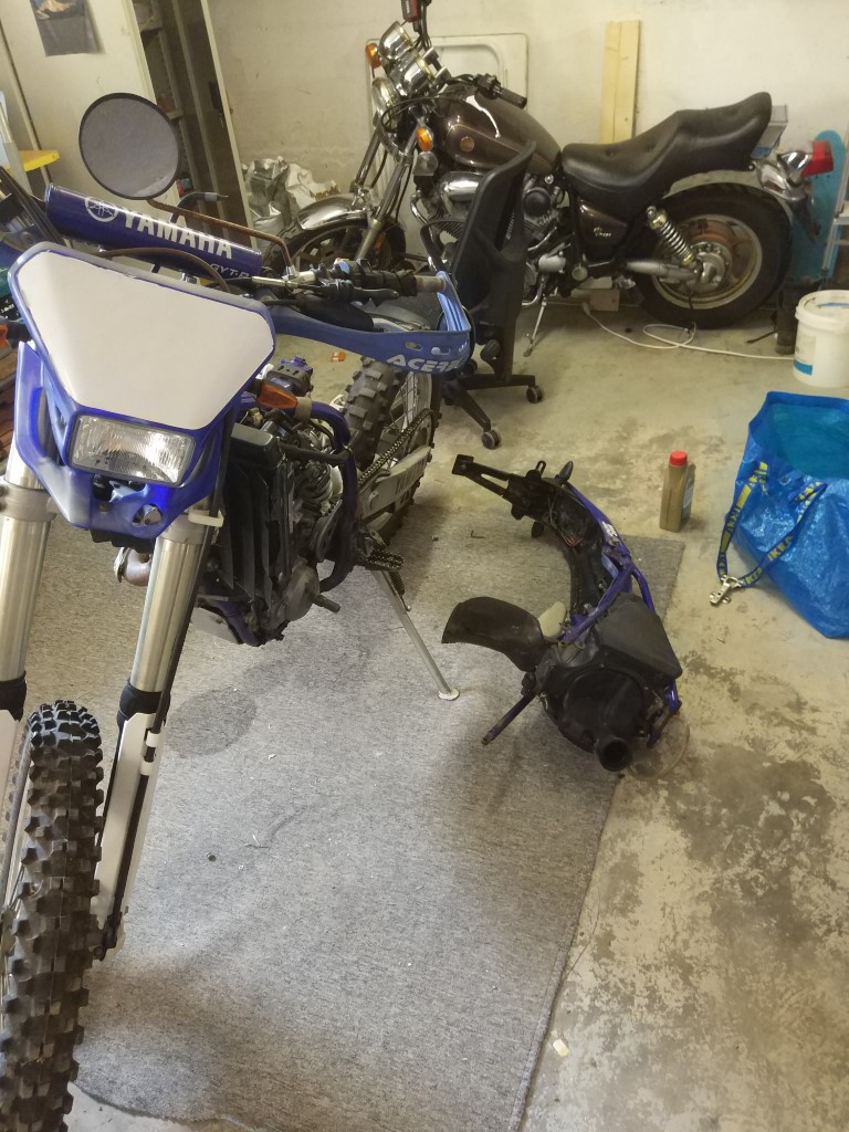 Es ist eine WR 400 F, Baujahr 2001. Sie ist mit Crossrädern aber auch mit Sumorädern ausgestattet. Als sie hier ankam sah sie arg mitgenommen aus. Die Verschalung war völlig ausgebleicht, sogar stellenweise bröckelig, und der Rahmen hatte Teilweise oberflächlichen Rost. Da sie nicht anlief, habe ich mich dazu entschieden den Vergaser zu demontieren und zu reinigen. Es wurden auch sämtliche Dichtungen ersetzt. Jetzt haben wir sie wieder zusammengebaut. Das Heck lässt sich sehr einfach, ohne Hammer und Rohrzange, entfernen und montieren. Es müssen nur drei Schrauben gelöst werden. Beim Einbau des Vergasers ist darauf zu achten, dass sämtliche Anbauteile, wie Schläuche und externe Stellschrauben, schon vorher montiert werden, ansonsten macht die ganze Arbeit mehrmals. Nun ist alles soweit wieder montiert und als nächstes steht nun der Ölwechsel an. Das Öl haben wir schon abgelassen und am Donnerstag sollte der benötigte Filter geliefert werden.