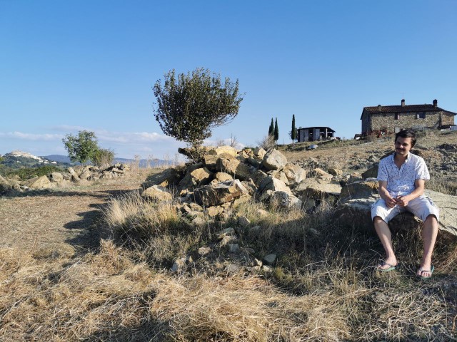 Und so ging der Nachmittag vorüber, bei gutem Wein und Fleisch und mit lustigen Unterhaltungen. Irgendwann meinte Mario, der 80 Schafe hat, er müsse heute doch noch was arbeiten. Wir packten die Gelegenehit und gingen mit, denn ich wollte ubedingt noch auf seinen Hof. So ging es mit dem Renault Kangoo zurück nach Serrazzano und weiter zum Hof von Mario. Meine Freundin im Laderaum und ich durfte mich auf den Beifahrersitz setzen. Auf dem Hof angekommen begrüssten uns die Herdenschutzhunde. Diese sind am Tag sehr friedlich, Nachts weniger, das kann ich euch bestätigen. Einer war jung und war noch nicht so lange bei Mario angestellt. Er hatte Freude daran die Schafe zutreiben und so kam es, dass plötzlich ein Teil der Herde hinter dem Haus und nicht mehr auf der eingezäunten Wiese stand. Veilleicht lag es auch am tiefen Zaun aber dies ist nur eine Hypothese. Unter den Wiesen rund um Marios Hof gibt es wenig Erde auf dem felsigen Untergrund. Deshalb verteillt Mario immer wieder Stroh, dies schützt das vorhandene Grass und es entsteht neue Erde. Dabei halfen wir Mario, wie schon in vergangen Jahren. Wie die Arbeit in meiner Werkstatt, ging auch diese Arbeit bestens in Flipflops.