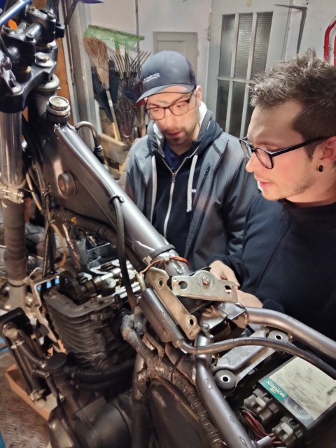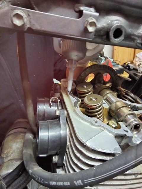 Jetzt mussten der Zylinder und der Ventildeckel von der alten Dichtmasse bereinigt werden. Es gibt an dieser Stelle keine herkömmliche Dichtung, anstelle dessen wird eine Dichtmasse angebracht. Die alte Dichtmasse entfernte ich mit 120er Schleifpapier. Nachdem alle Stellen frei von der alten Dichtmasse waren, reinigte ich sie mit Bremsreiniger. Die Dichtmasse bringt man in Form einer kleinen Wurst an und wird dann mit dem Finger verteillt. Der Finger sollte innerhalb eines Handschuhes sein! Soviel dass sie sich auf der Fläche verteilt aber nicht bis in den Motor eindringen kann. Bei der Montage, muss man dann darauf achten, dass man die Dichtmasse nicht verschmiert. Dies wurde von einem Profi erklärt und begleitet, herzlichen Dank Martin!! Dieser Profi fischte danna uch die schon lange vermisste Bit aus dem Kerzensteckerloch.