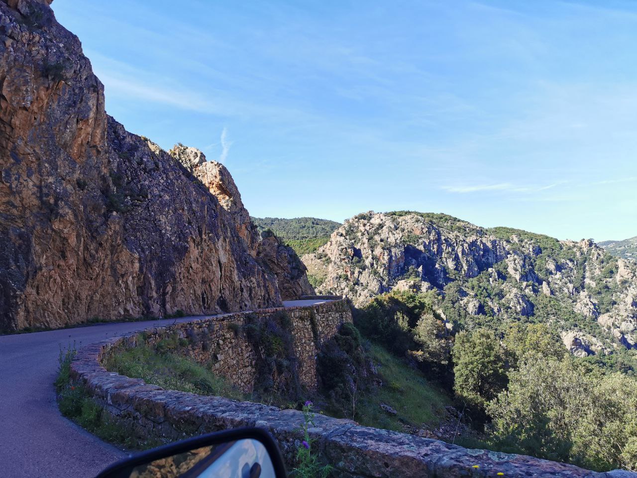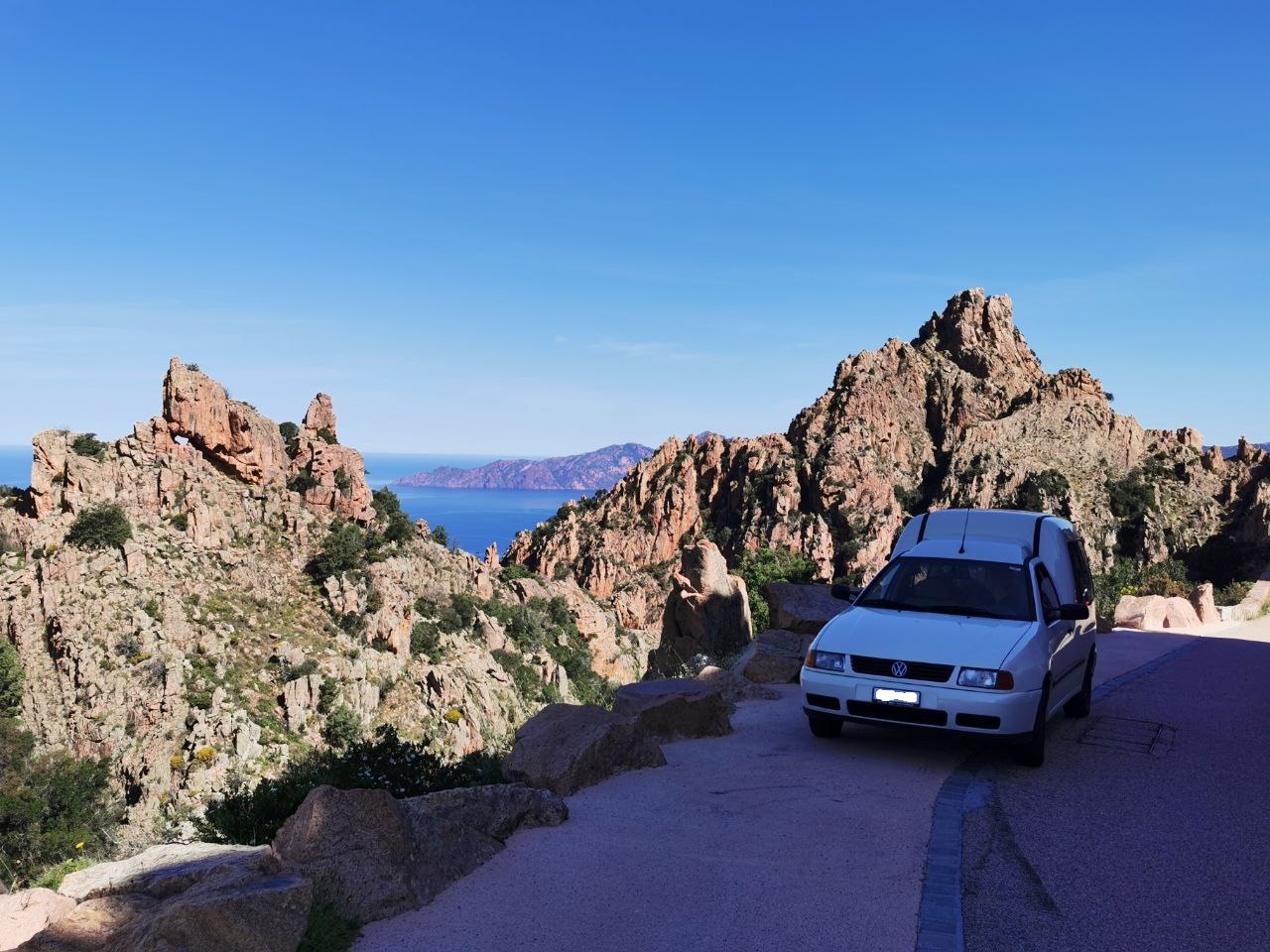 Der alt bekannte Ort kam immer näher und es fühlte sich für mich immer mehr wie ein zurück kommen an. Es handelt sich um den Ort Porto. Auf meiner Europatour 2018 war hier einer der einzigen noch offenen Campings, der Sole e Vista Camping. 2018 war ich am Ende von meiner Tour in Korsika, ich hatte den Reisekoller und verbrachte ein paar Tage auf dem Camping Sole e Vista mit Karten und Tagebuch schreiben und mit baden. Nun waren wir wieder hier und ich konnte meiner Freundin diesen mir vertrauten Ort zeigen, hmm darüber freute ich mich sehr. Der Camping befindet sich am Hang und man hat eine wunderbare Aussicht. So blieben wir auch dieses Mal zwei Tage. Unten in der Bucht gab es viele Restaurants, ganz herzig. Am zweiten Tag versuchten wir eine Rundwanderung zu machen, denn die Berge hier laden zum wandern ein. Wir erwischten den falschen Weg und mussten so den gleichen Weg wieder zurück gehen, schön war es trotzdem. Den Nachmittag liessen wir am Strand ausklingen. Zum richtig baden war es jedoch zu kalt, für schnell rein und raus reichte es jedoch. Die Kletterer an den Felsen schienen mehr Spass an dem sonnigen Wetter zu haben. Von 2018 gab es ein Foto in einer Ausweichbucht mit Valentina, die Yamaha XSR 700 die mit mir damals unterwegs war. Dieses Foto stellten wir nach den zwei Tagen mit dem Caddy nach, als es weiter ging in Richtung Süden....