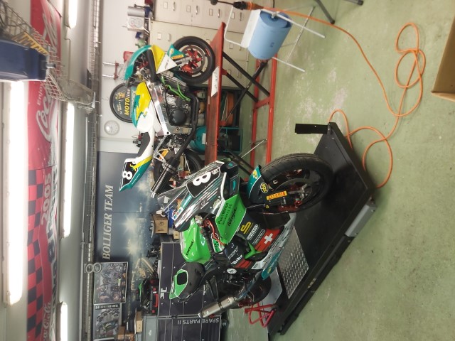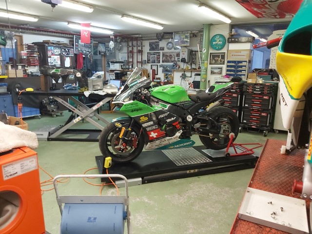 Schon lange verfolge ich das schweizer Langstreckenteam Bolliger. Ich entdeckte sie als Horst Saiger noch für das Team fuhr und von jedem Rennen ein Video auf Youtube veröffentlichte. Je länger ich sie verfolgte, desto mehr Fragen kamen in mir auf. Und so nahm ich allen Mut zusammen und fragte beim Team Bolliger nach, ob sie an einem Interview interessiert wären. Kevin Bolliger, der Teamchef, antwortete mir schon bald und ich durfte ihn in der Werkstatt des Teams besuchen, irgendwo im Kanton Bern. Ich freute mich sehr. So fuhr ich an einem Mittwochabend mit meinem Caddy in Richtung Biel. Ich freute mich sehr. Dort angekommen wurde ich von Kevin und der Werkstattskatze freundlich begrüsst. An den Wänden der Werkstatt sind unzählige Bilder aus der nahen und fernen Vergangenheit von Motorräder, Rennen und Rennfahrer zu sehen. In der Mitte des Raumes standen drei Hebebühnen auf einer Stand eine Kawasaki ZX-10R und auf der anderen eine Kawasaki ZX-7. Dahinter sind Werkbänke mit unterschiedlichsten Motorradteilen wie Felgen oder Motoren zu sehen. Auch der ausgebrannte Motor aus Bol d'Or. Nach den ersten beantworten Fragen, tauchte auch Kevins Vater, Hämpu auf. Der frühere Teamchef ist nun im Hintergrund tätig und unterstützt Kevin. Für das Interview führt mich Kevin in die über der Werkstatt liegende Bar, "Hämpus Bar". Und da waren noch viel mehr Zeitzeugen vorhanden. An der Decke hingen alte Kombis, überall waren Pokale zu sehen es gibt eine Leinwand, dazu kommen wir später noch und eine Bar. An diese Bar setzten wir uns und ich begann Kevin mit Fragen zu löchern.