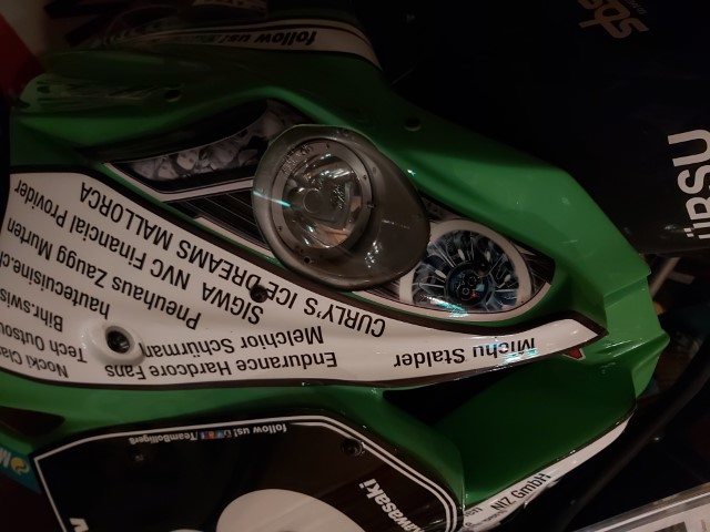 Ja das stimmt, es kommt auch keiner und sagt, hey cool gemacht. Du musst mal da bei dem Scheinwerfer schauen, siehst du, dass dich dort Menschen anschauen? Links neben der Lampe auf dem Kleber. Das ist ein Teamfoto dass sich im Hintergrund befindet. Darunter hast du ja noch eine zweite Lampe, siehst du dass da drei Sachen stehen? Spirit, 1982 und Passion. Das sind die drei Sachen die unser Team ausmachen. Das sieht niemand. Du bist einer von wenigen Personen die das wissen. Nicht, dass ich es geheim halten will aber einfach weill ich niemand darauf aufmerksam gemacht hatte. Am Schluss geht das darum, das du ein schönes Motorrad hast oder nicht. Das schöne ist, wir sind kein Werksteam, bei uns sagt niemand diese Ecke da, die muss grün sein. Mit den Sponsoren muss man sich jedoch absprechen und das Design genehmigen lassen. Das erste Design, das wir von dem Motorrrad unten hatten, wurde zum Beispiel von Motorex grosszügig abgelehnt.