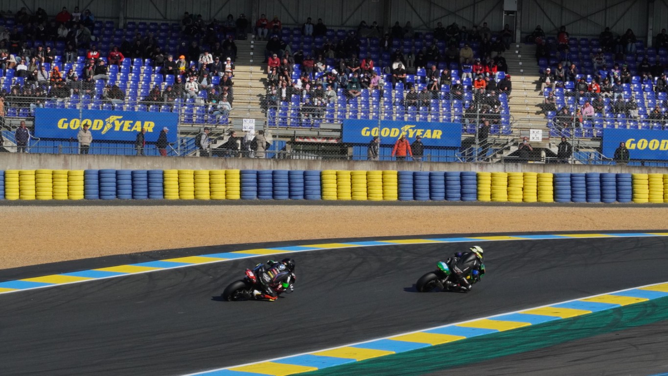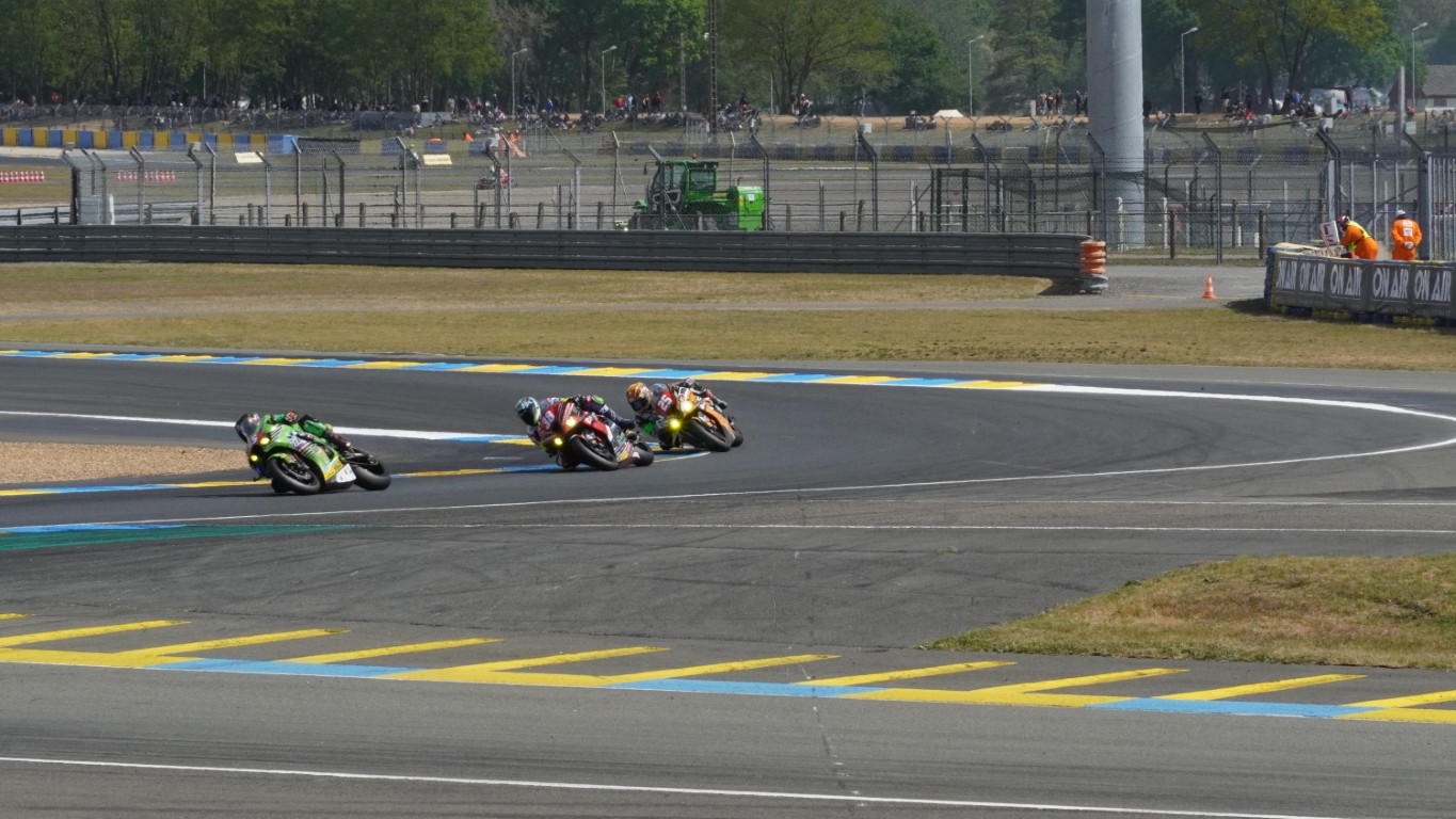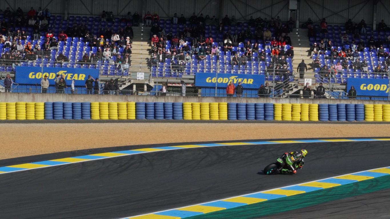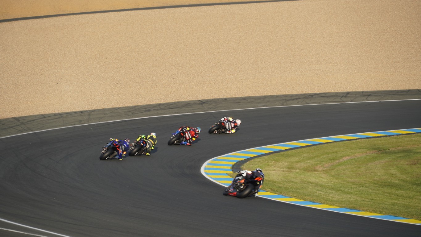 Dann kamen die Securitys und ich musste die Startaufstellung verlassen. Mirko, der Social-Media-Verantwortliche vom Team Bolliger, fragte mich, ob ich mit ihm zur ersten Kurve komme, um den Start anzusehen. Ich freute mich und ging mit. Oben angekommen, genossen wir die französische Nationalhymne, die mit viel Herzblut gesungen wurde und überall auf der Rennstrecke zu hören und zu spüren war. Dann ging es schon los und die 60 Motorräder bretterten an uns vorbei. Eindrücklich, aber leider habe ich den legendären Le-Mans-Start so verpasst. Wir wechselten noch ein paar Mal die Position und machten unsere Aufnahmen. Alex ist der Start geglückt, er fuhr von Startplatz 14 auf 10. Nach 20 Minuten wurden dann schon die ersten überrundet. Ich wollte nicht zu lange draussen an der Strecke bleiben, denn ich wollte beim ersten Fahrerwechsel und Boxenstopp dabei sein.
