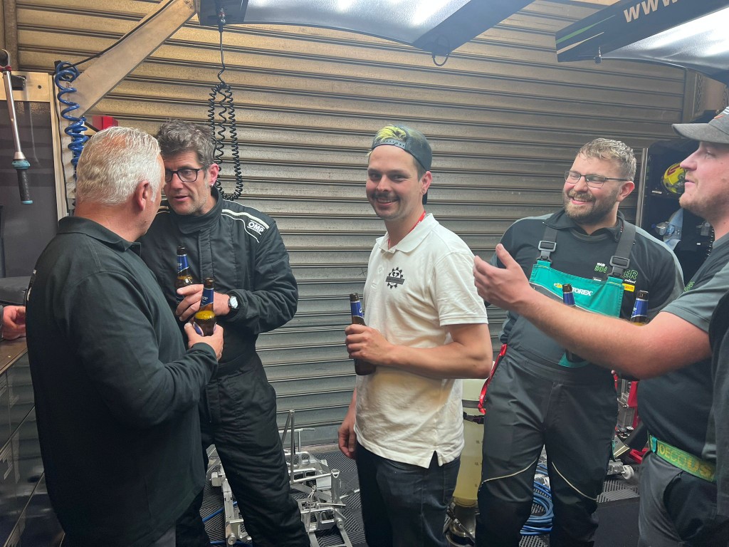 Dann war 15 Uhr und wir rannten alle auf die Boxenmauer, um die Fahrer jubelnd im Ziel zu begrüssen. Freunde, da waren bei mir alle Dämme gebrochen, meine Knie zitterten und die Tränen flossen und ich konnte mich schlecht beruhigen. Es half auch nicht, als sich alle in den Armen lagen. Wir waren auf dem gesamten 7. und in unserer Klasse auf dem 6. Rang ins Ziel gefahren. Das bedeutet 30 Runden hinter dem Gewinner Yart, 829 gefahrene Runden und 27 Pitstopps, die gesamthaft 51 Minuten und 15 Sekunden dauerten. Das Ergebnis war aber in diesem Moment Nebensache, wir freuten uns einfach, dass wir es geschafft hatten. Die Motorräder kamen nach der Auslaufrunde zurück in die Box und es gab den einen oder anderen Burnout. In der vergangenen Woche fragte ich mich immer wieder: Wieso macht man diesen ganzen Aufwand? Bei der Zieleinfahrt wurde es mir zum wiederholten Male bewusst, wieso. Als ich mich etwas beruhigte, ging ich in die Box, da umarmte man sich und stiess mit Aarebier an und es gab wie so oft einen Schnupf, aber dieser war ganz besonders. Bald merkte ich, ich war nicht der Einzige, der Tränen in den Augen hatte. Auch Lüschi war sichtlich gerührt und meinte gutmütig: «Weisch Luki, das muäsch eiifach usä laah, das isch doch öbis schöns».
