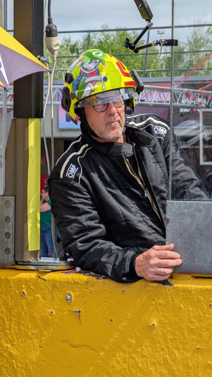 Nun ging alles schnell. Ich war noch zweimal draussen für Fotos. Und dann war schon Mittag und es ging nur noch 3 Stunden. Der Erste hatte zu diesem Zeitpunkt Feierabend, Adi, der Zeitnehmer, denn die arbeiteten in 3-Stunden-Schichten. Sie sind das Verbindungsglied zwischen Fahrer und Box. Über die elektrische Boxentafel, die elektrisch rausfährt, können sie dem Fahrer die Infos aus der Box mitteilen. Der Fahrer kann aber auch anzeigen, wenn er in die Box will, indem er den Fuss rausstreckt. In einem solchen Moment hat dann das Boxenteam eine Runde Zeit, sich vorzubereiten, bevor der Fahrer in die Box fährt.