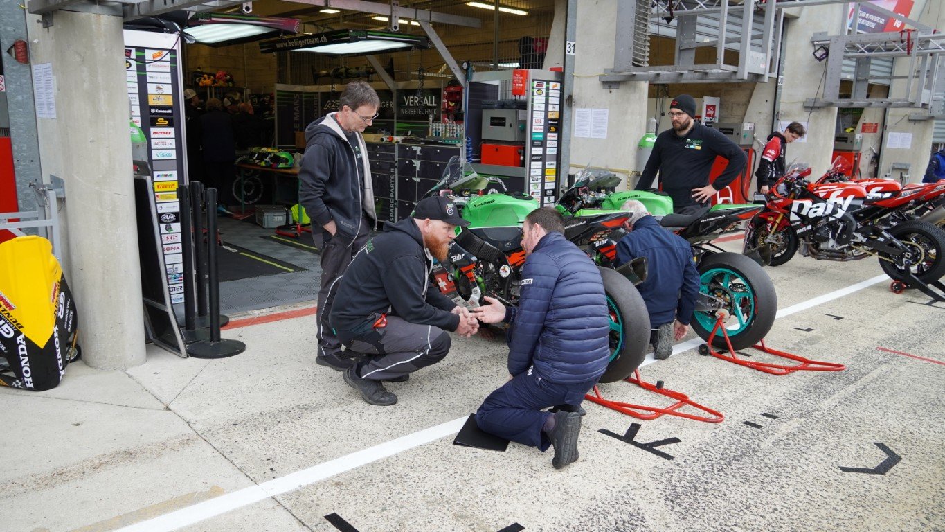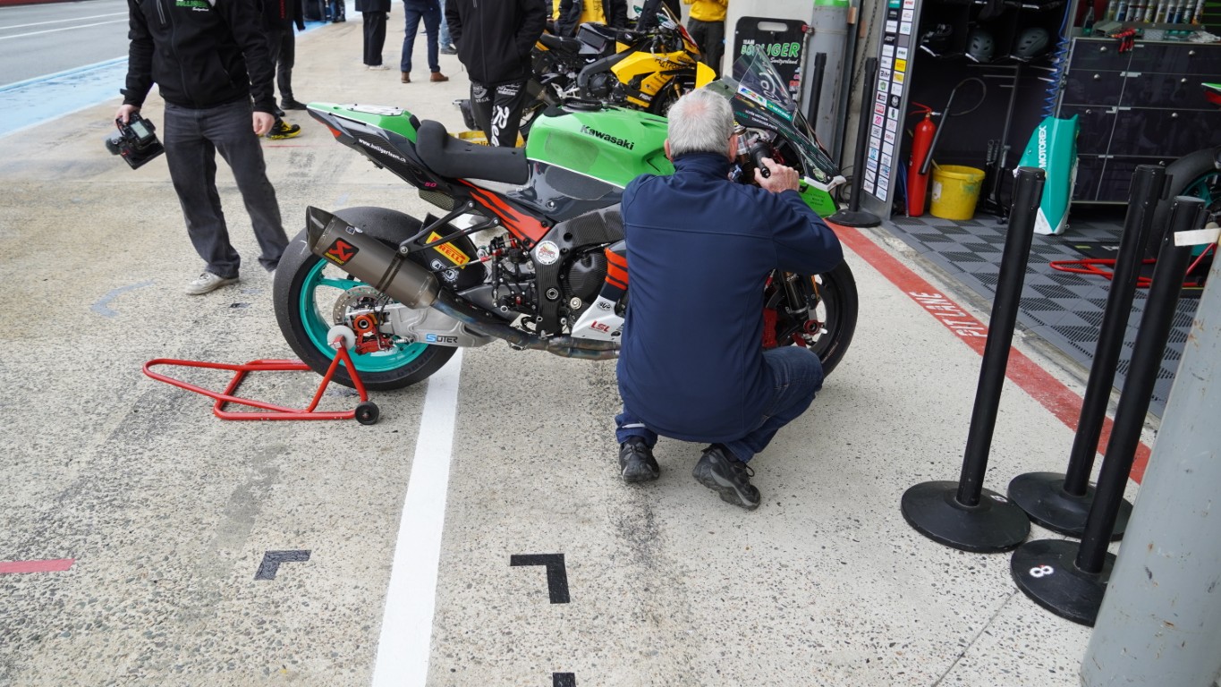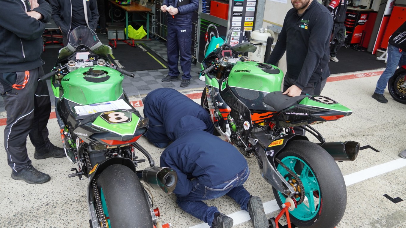 Ich nutze den Morgen, um ein Video zu schneiden. Es dauert nicht lange, bis Kevin mich ruft – die technische Abnahme steht an. Die Prüfer kommen in die Box, um die Motorräder zu inspizieren. Danach geht es in die Technical Bay (Parc fermé) – nicht zu verwechseln mit Baywatch – für die Lautstärkenmessung und das Wägen. Bei der Lärmmessung dürfen bei 5500 Umdrehungen die 105 dB nicht überschritten werden. Nach dem Rennen darf das Motorrad 3 dB lauter sein. Jeder Auspuff, auch die als Ersatz mit dabei sind, müssen geprüft werden. Das minimale Gewicht wird ebenfalls nicht unterschritten, und so ist alles in Ordnung. Sie bekommen einen Kleber mit einer Prüfnummer. Nun dürfen theoretisch beide Motorräder an den Start. Es ist jedoch bereits klar, welches Motorrad am Samstag eingesetzt wird. Das andere muss innerhalb der ersten Runde des Rennens ausserhalb der Box sein. Dort wird es dann auch gleich von Fäbu und Küsu auseinandergenommen, denn dieses Motorrad dient ab diesem Zeitpunkt als Ersatzteillager.