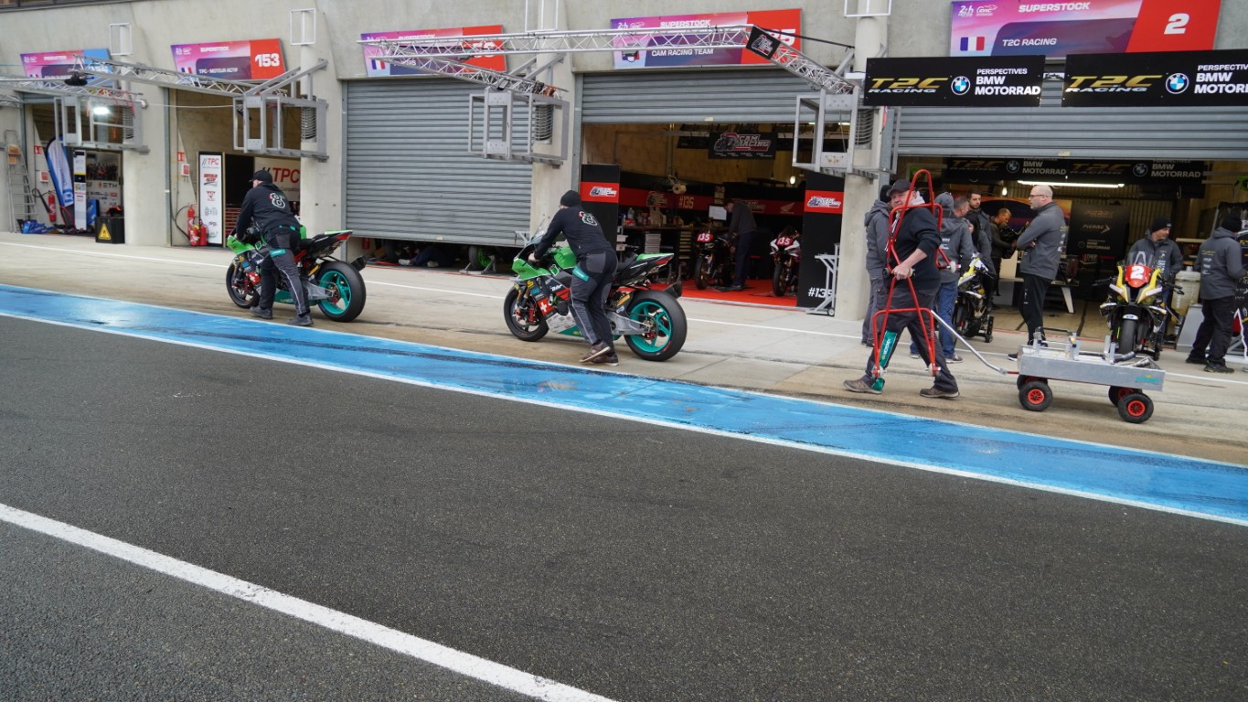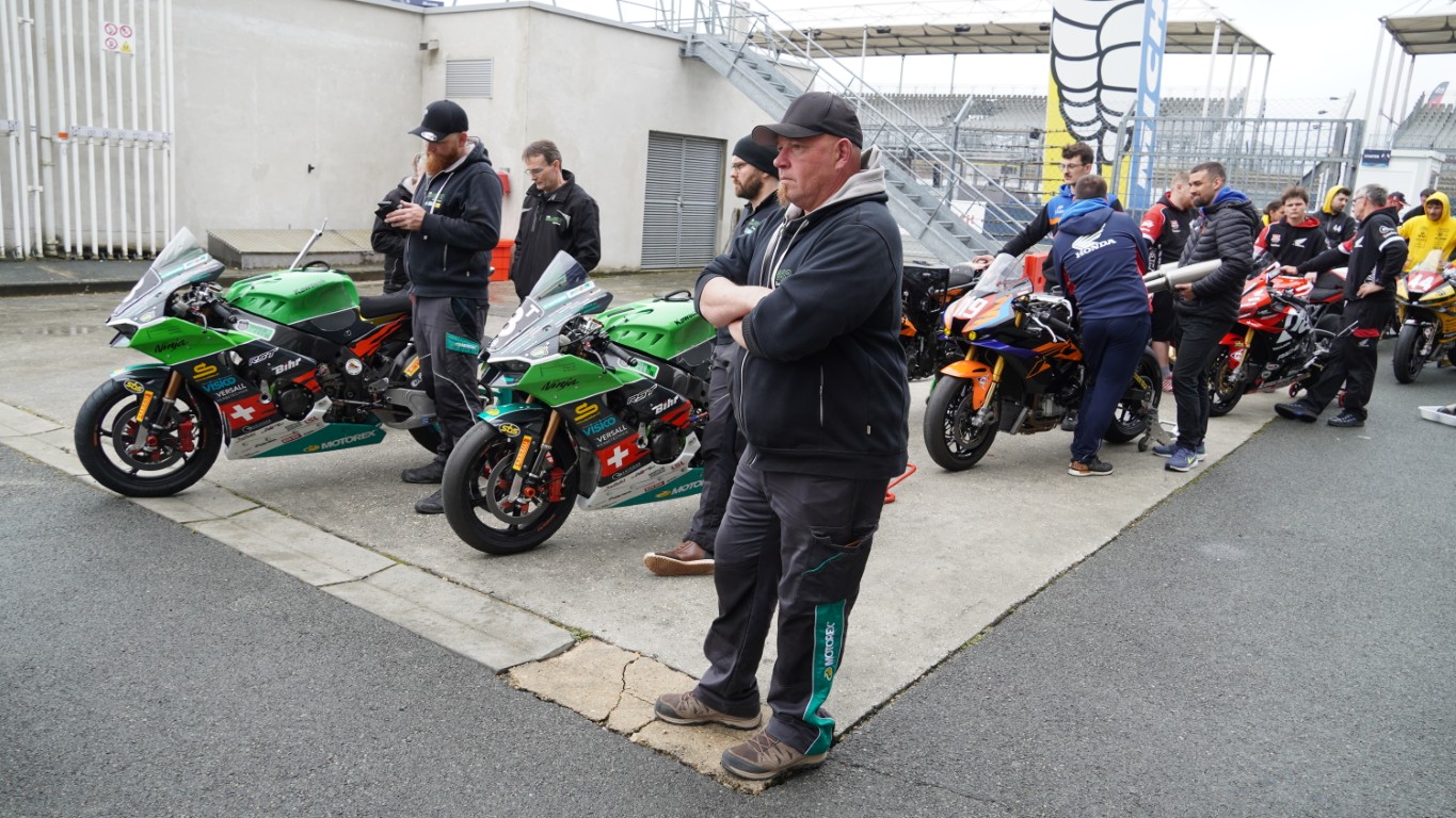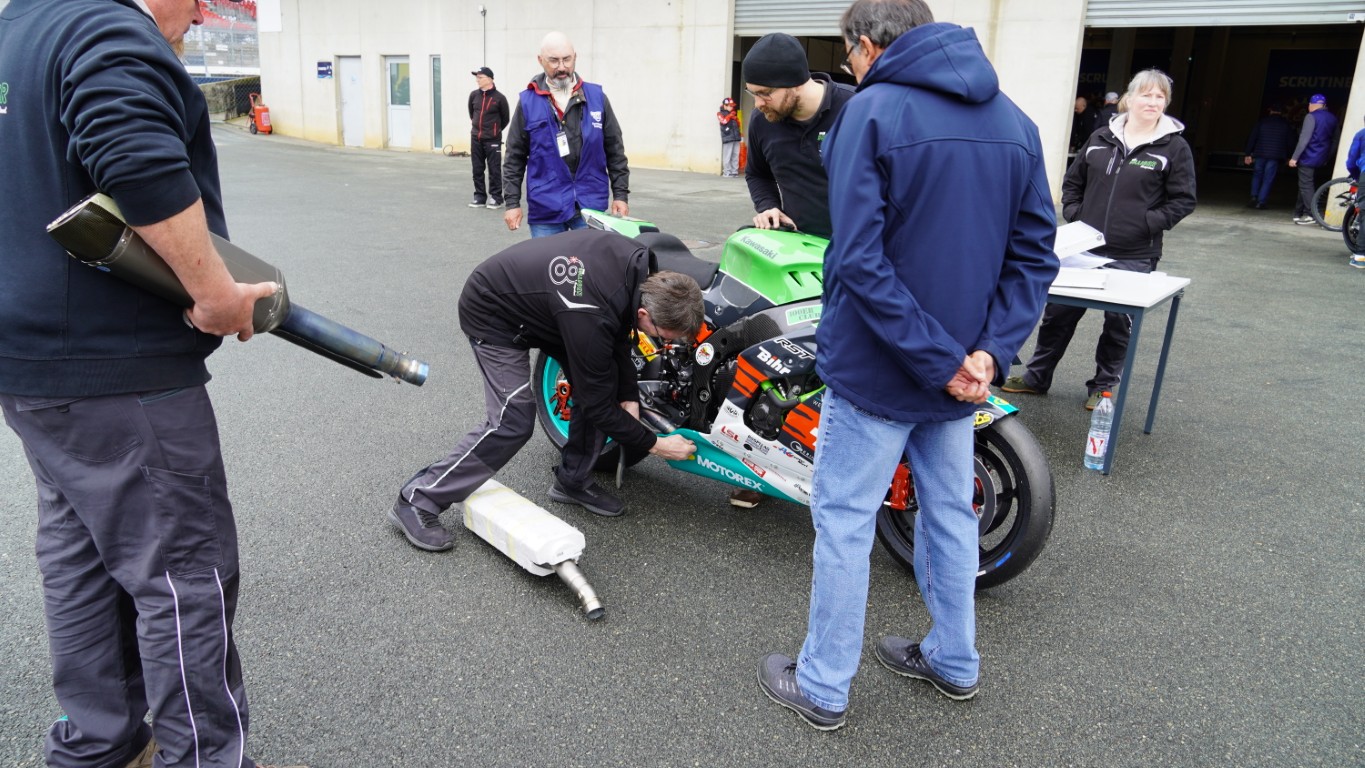 Ich nutze den Morgen, um ein Video zu schneiden. Es dauert nicht lange, bis Kevin mich ruft – die technische Abnahme steht an. Die Prüfer kommen in die Box, um die Motorräder zu inspizieren. Danach geht es in die Technical Bay (Parc fermé) – nicht zu verwechseln mit Baywatch – für die Lautstärkenmessung und das Wägen. Bei der Lärmmessung dürfen bei 5500 Umdrehungen die 105 dB nicht überschritten werden. Nach dem Rennen darf das Motorrad 3 dB lauter sein. Jeder Auspuff, auch die als Ersatz mit dabei sind, müssen geprüft werden. Das minimale Gewicht wird ebenfalls nicht unterschritten, und so ist alles in Ordnung. Sie bekommen einen Kleber mit einer Prüfnummer. Nun dürfen theoretisch beide Motorräder an den Start. Es ist jedoch bereits klar, welches Motorrad am Samstag eingesetzt wird. Das andere muss innerhalb der ersten Runde des Rennens ausserhalb der Box sein. Dort wird es dann auch gleich von Fäbu und Küsu auseinandergenommen, denn dieses Motorrad dient ab diesem Zeitpunkt als Ersatzteillager.