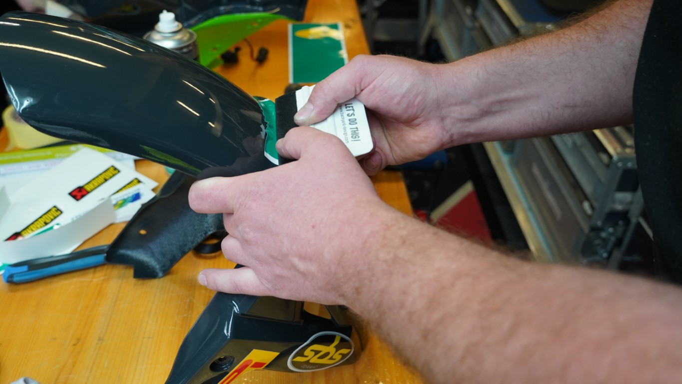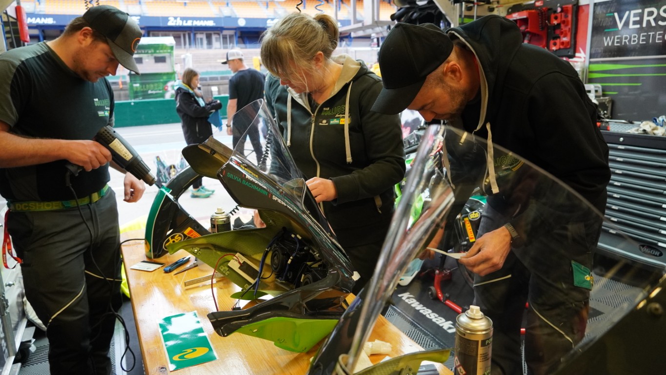 Nachdem sie den Fototermin mit allen anderen Fahrern, die beim 24-Stunden-Rennen starten, hinter sich haben, müssen sie weiter zur Fahrerbesprechung, und wir fahren zurück auf die Rennstrecke, nach Hause in die Box. Dort sind die anderen gerade dabei, die Ersatzverschalungsteile mit den entsprechenden Klebern zu versehen. Jede Front, jedes Seitenteil und jedes Heck muss gleich aussehen – und dafür sorgt das Team mit grösster Sorgfalt.
