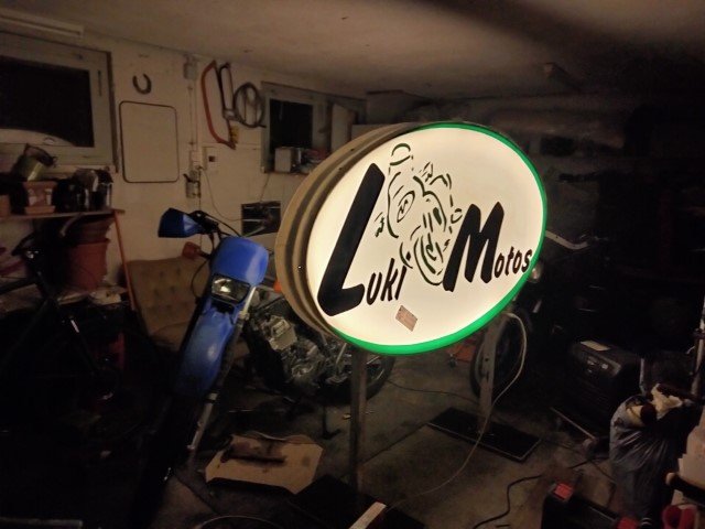 Vor circa einem Jahr schloss Luki seine Werkstatt für immer. Jedes Mal, wenn ich bei seiner geschlossenen Werkstatt vorbeifuhr, sah ich das Schild an der Hauptstrasse stehen. Ich dachte darüber nach ihn anzurufen, ob er das Schild noch brauche, denn auch ich heisse Luki und liebe Motos. Anscheinend dachte ich auch laut darüber nach. Irgendwann vergass ich jedoch diesen Gedanken. Bis zu meinem 30. Geburtstag, ja den hab ich auch schon hiter mir. Die Frau meines Cousins kam rein und meinte, ich soll mal raus kommen. Draussen konnte ich meinen Augen nicht trauen, inmitten meiner Freunde stand das Schild von Luki Motos, ei hatte ich eine Freude. Noch heute muss ich grinsen, wenn ich daran denke, dass das Schild von Luki bei mir in der Garage steht. Danke an alle Freunde, Familienmitgleider und liebe Menschen die das möglich gemacht hatten, dankä vielmol!!