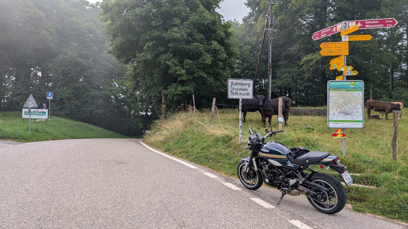 Nach dem Weissenstein folgte an diesem Tag die grösste Prüfung für Mensch und Maschine. Die steilste Strasse des Kantons Solothurn stand bevor: der Balmberg mit Steigungen bis zu 25 Prozent. Doch auch hier kam ich mit der Kawasaki Z900 RS gut voran. Man sitzt nah am Lenker und hat die Maschine stets unter Kontrolle. Oben angekommen, zeigte sich zum ersten Mal die Sonne.