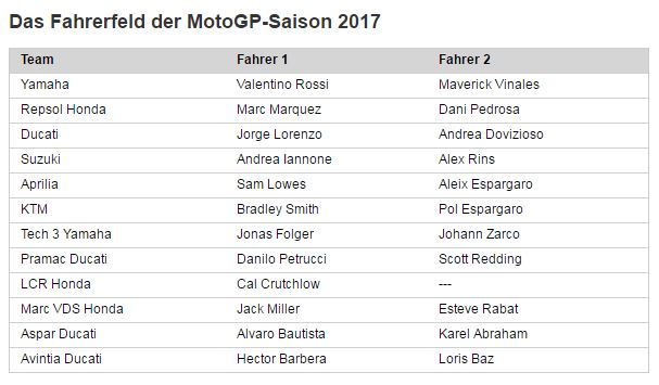 In den Teams hat sich einiges geändert, da einige Moto 2 Piloten nachgerückt sind. Bei Yamaha bleibt natürlich Rossi, durch den Abgang von Lorenzo zu Ducati wurde der Platz auf der zweiten Yamaha M1 frei, welcher für 2017 nun mit Maverick Vinales besetzt wird. Er zeigte in den Trainings vor der Saison eine starke Leistung und liess die grossen Namen in der MotoGP aufhorchen. Bei Ducati fährt nun ein Spanier Jorge Lorenzo und Dovizioso blieb im Team. Honda, Pramac Ducati, Marc VDS Honda, LCR Honda und Avintia Ducati sind die einzigen Teams welche unverändert bleiben. Nun kommen wir zu den Neuankömmlingen. Im Team Suzuki fährt nun neben Ianone Alex Rins. Aleix Espargaro hat von Suzuki zu Aprillia gewechselt. Sein Teamkollege ist Alex Lowes. Stefan Bradel hat in die Superbike zu Honda gewechaelt. alvaro Bautista, Bradels Teamkollege bei Aprillia 2016, wechselt zu Aspar Ducati wo er neben Karel Abraham mitfährt. Im Team Tech 3 fahren die Rookies Folger und Zarco. Folger fuhr in den Tests schon ziemlich weit vorne mit. Die beiden Tech 3 Fahrer aus 2016 fahren nun im neun Team KTM. Wer nun den Überblick verloren hat, hier die Übersicht: