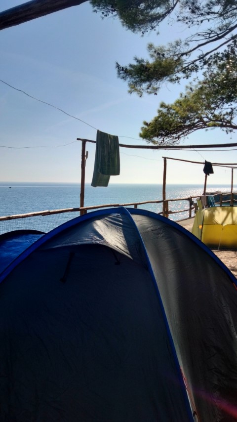 Meine Freundin, die Ruhe selbst, suchte einen neuen Campingplatz aus und übernahm die Aufgabe von Heinz-Günther. Wir fuhren zurück ans Meer. Als wir am Meer ankamen, standen wir plötzlich in einer langen Schlange. Dass die Autos ausgeschaltet waren, machte uns etwas nervös. Ich nahm meinen Helm ab und fragte meine Sozia, ob wir uns richtig befänden. Sie antwortete mit "ja". Nach gefühlten 30 Minuten bewegte sich die Schlange endlich. Wir fuhren in einen einspurigen Tunnel, der schier endlos schien. Dann kam eine Bucht, und meine Freundin sagte: "Jetzt raus." Ihr könnt euch vorstellen, dass ich nicht rechtzeitig reagieren konnte, und wir befanden uns bereits wieder im nächsten Tunnel. Mein Puls stieg weiter an. Also fuhren wir durch die Tunnel, um dann zu wenden. Das war der Plan. Doch bevor wir aus den unzähligen Tunneln herauskamen, sahen wir ein Schild: "In 50 Metern, Camping Smeraldo." Es war seltsam, denn ich konnte weiter als 50 Meter sehen, und das Ende des Tunnels war nicht erkennbar. Dann kam ein Schild: "In 10 Metern rechts, Camping Smeraldo." Plötzlich war da ein Loch in der rechten Seite des Tunnels, drei Meter breit und etwa so hoch. Wir fuhren heraus und fanden uns auf dem Campingplatz Smeraldo, direkt über dem Meer. Die ganze Aufregung, der hohe Blutdruck, schien in einem Moment vergessen. Ich war mit meiner Freundin und dem ältesten Motorrad, das ich besaß, am Meer angekommen. Und das an einem wunderschönen Ort. Ich war sehr glücklich.