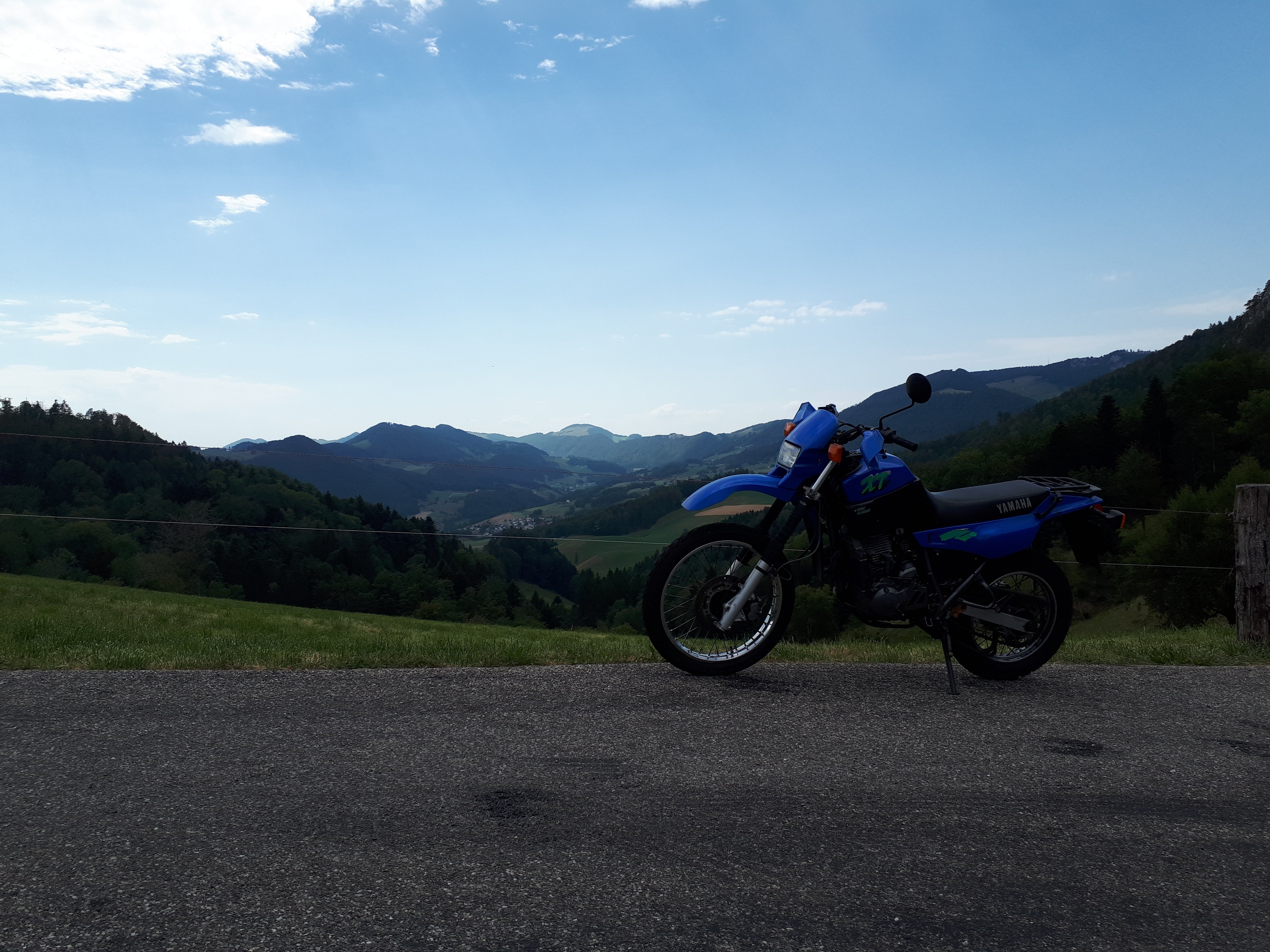 Viel zu heiss für aufs Motorrad sitzen? Ja eigentlich schon, wenn dann hätte man am Morgen früh los müssen. Das Bett war jedoch zu gemütlich und die Müdigkeit zu gross. So war ich um 2 Uhr immer noch nicht auf dem Motorrad. Ein kurzer blick zu meiner XT, die vor der Tür stand, reichte dass ich mich doch noch auf das Motorrad schwang und eine kurze Tour unternahm. Die Angsstreifen am Hinterreifen sind noch viel zu gross also mussten schon ein paar schöne Kurven dabei sein. So entschied ich mich über den Passwang(984m), mein "Hausberg",in Richtugn Langenbruck zu fahren. Es hatte herrlich wenig Verkehr und ich konnte die Yamaha XT endlich mal ausfahren so wie es mir Freude macht. Vor Langenbruck machte ich dann noch einen kurzen Fotostopp auf der Breitehöchi(845m).