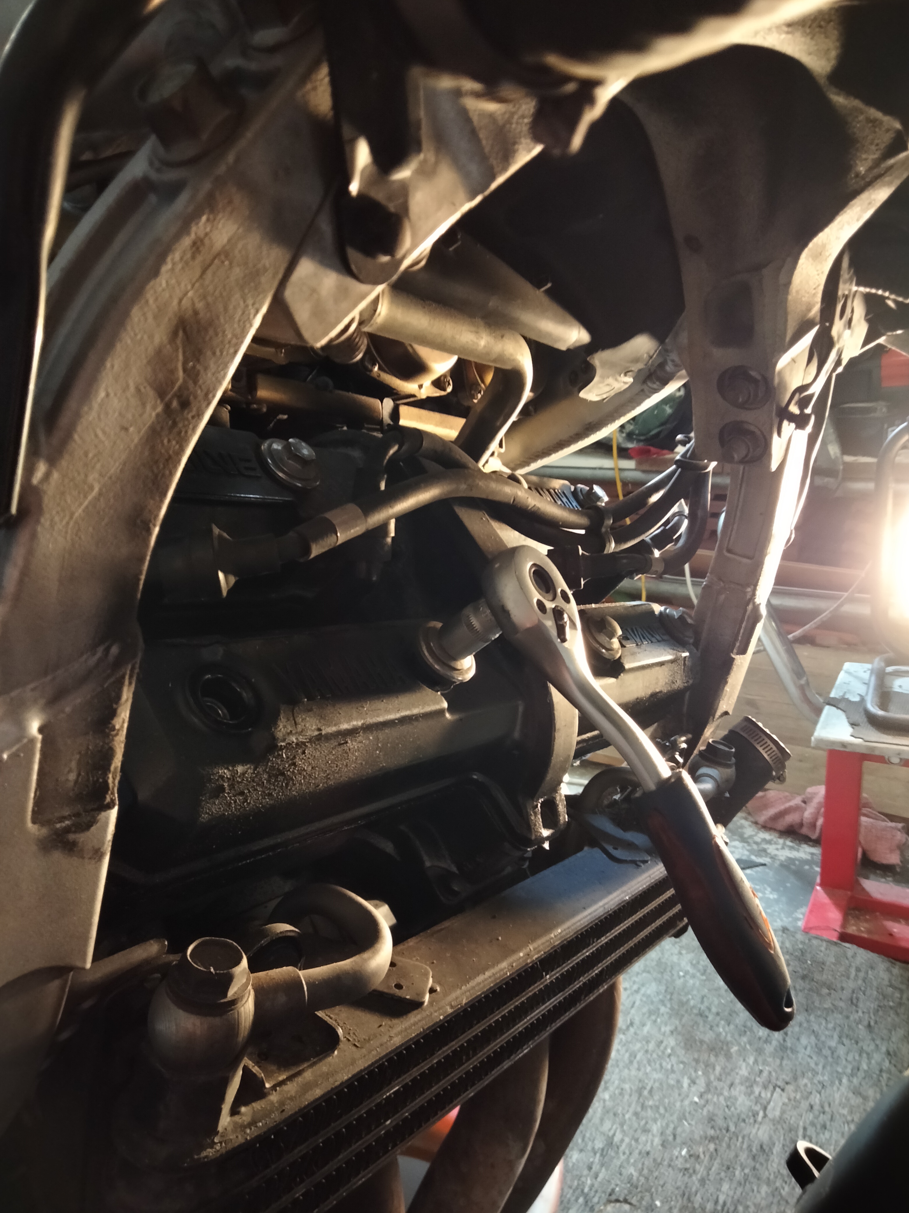 Nun musste nur noch der Zylinderkopfdeckel demontiert werden, neue Dichtung drauf, Zylinderkopfdeckel wieder montieren und neues Öl nachfüllen. Nur... Damit der Zylinderkopfdeckel demontiert werden kann, muss der Kühler weg. Da gibt es zwei Schrauben, links und rechts oben, die fühlt man knapp aber sehen kannst du sie nicht. Der Tank und Luftfilterkasten muss nicht demontiert werden, das kann ich euch als Erfahrungswert mitgeben. Als ich den Zylinderkopfdeckel endlich entfernen konnte fand ich auch gleich eine, schon länger, vermisste Nuss.