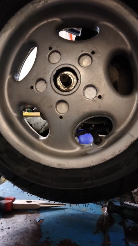5.Radmutter: Wenn der Auspuff demontiert ist, sieht man eine Abdeckung die nicht wirklich mit irgendeinem Werkzeug bearbeitet werden kann. Dies ist nur eine Abdeckung damit die Splinte die Mutter fixieren kann. Nach dem die Splinte entfernt ist, kann diese Abdeckung mit einem Schraubenzieher entfernt werden. Dies ging sogar bei meiner Vespa recht einfach. Danach kann die darunter liegende Mutter entfernt werden und man hat endlich das Hinterrad in der Hand.