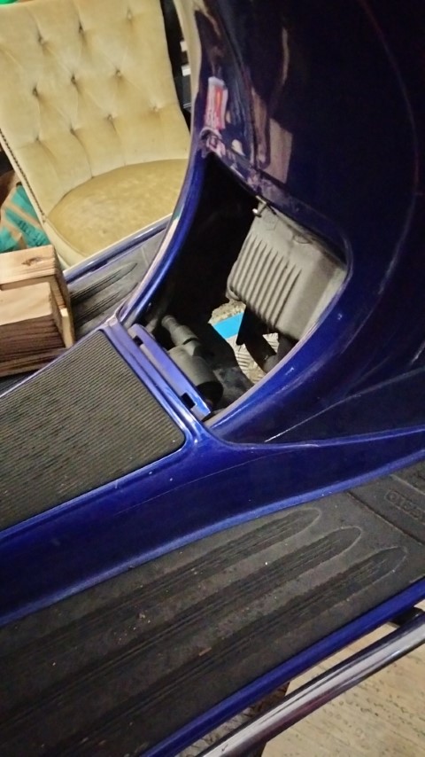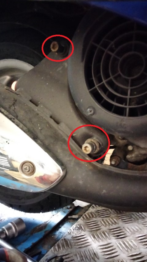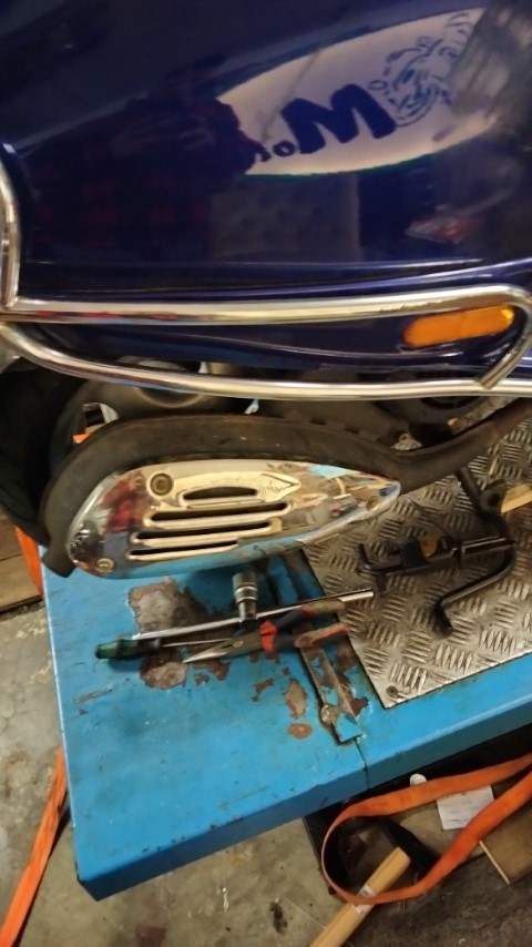 3.Auspuff demontieren: Dazu muss vorne unter dem Sitz eine Abdeckung demonitert werden. Durch diese Öffnung und von unten kann man dann die beiden Krümmerschrauben lösen. Dann müssen noch zwei Schrauben am Endtopf entfernt werden und man hat den Auspuff in der Hand.