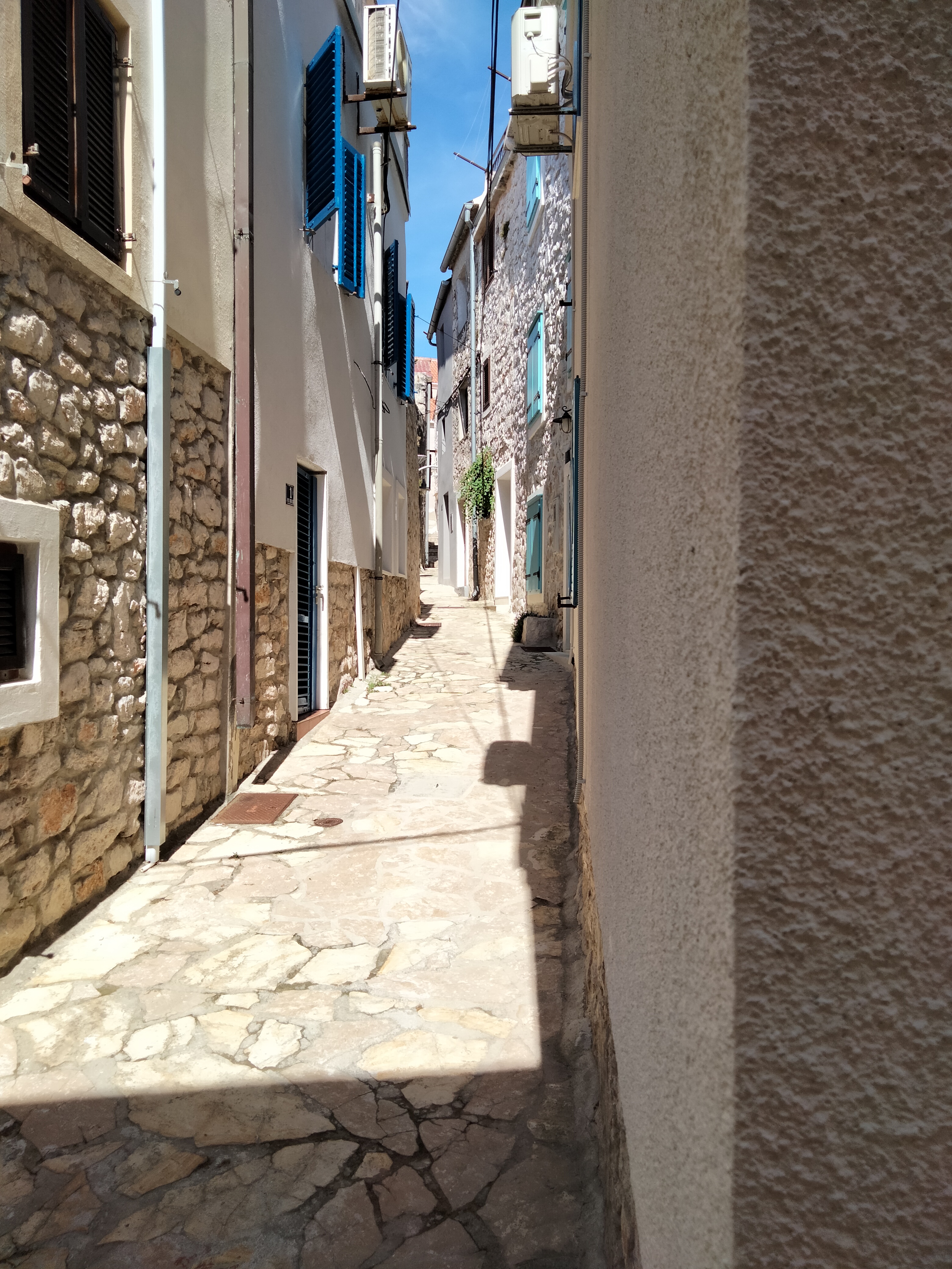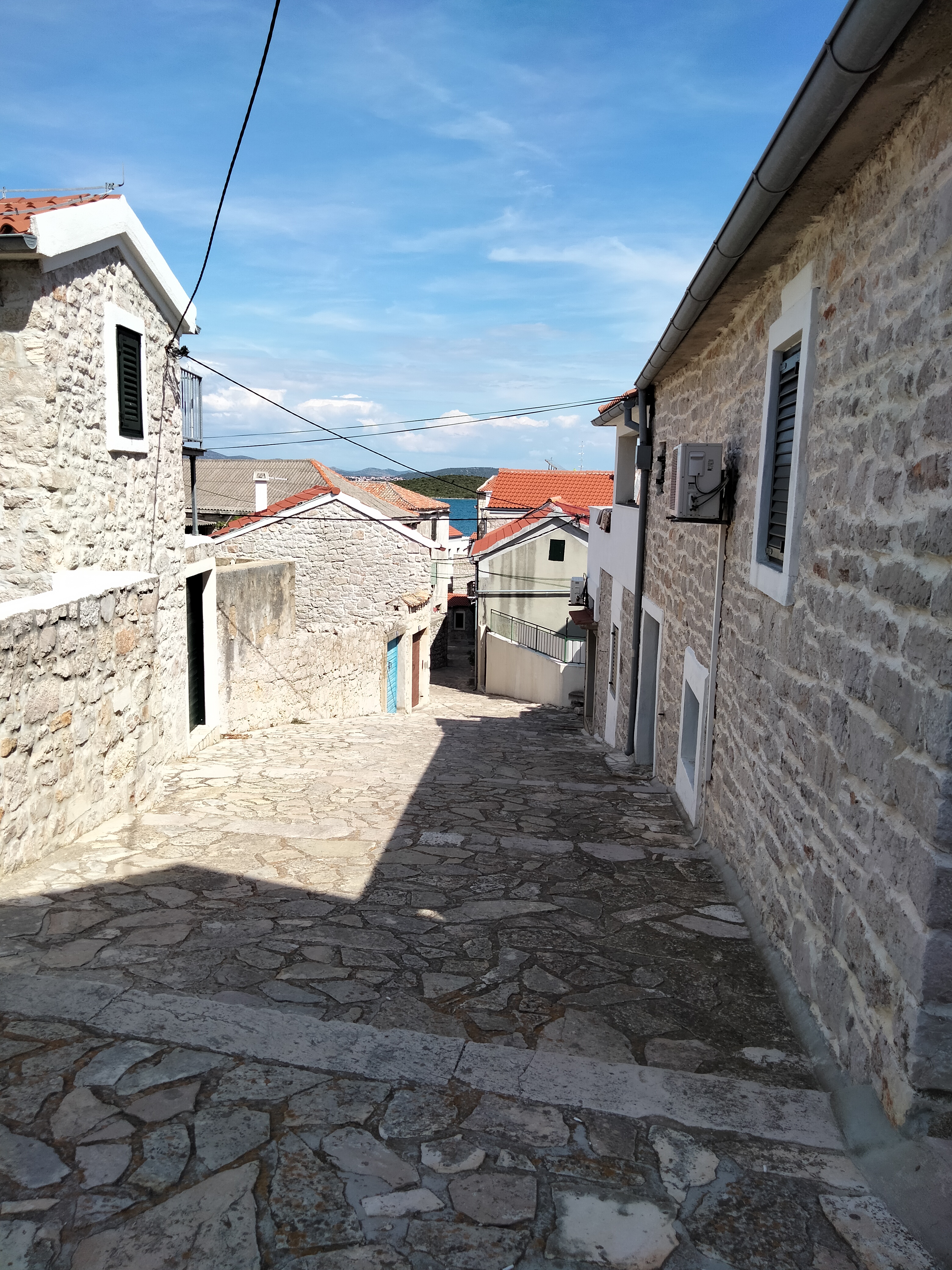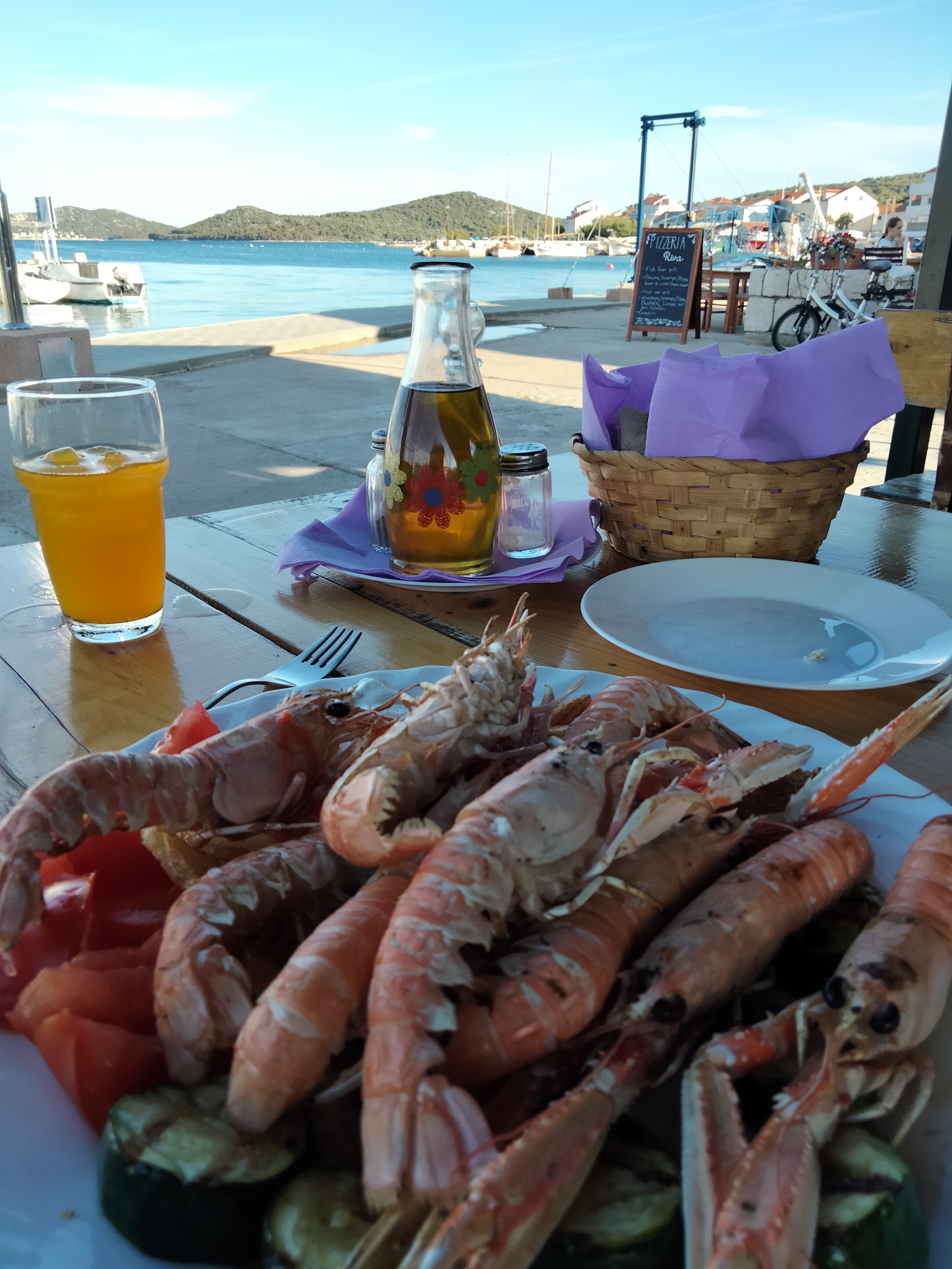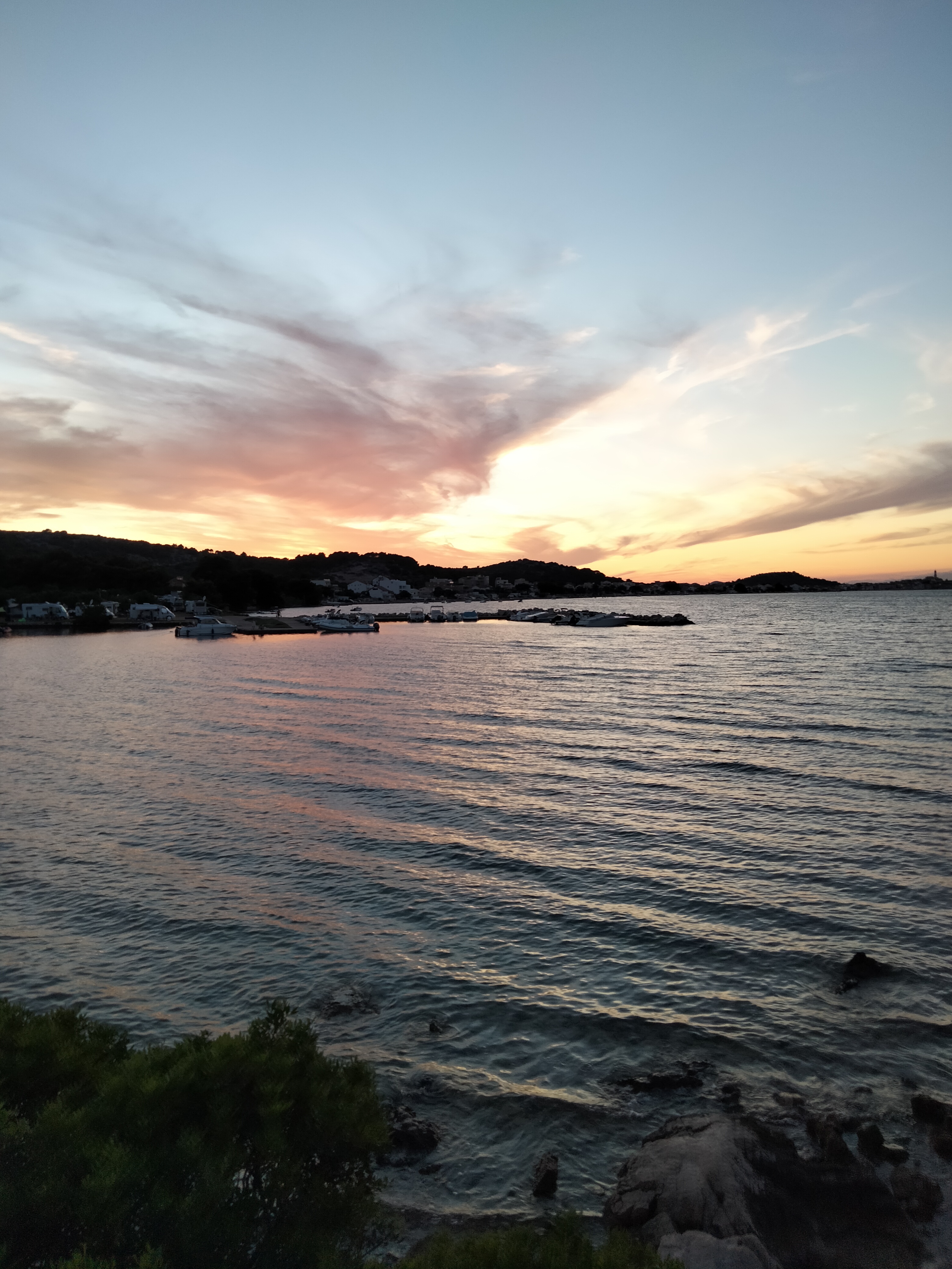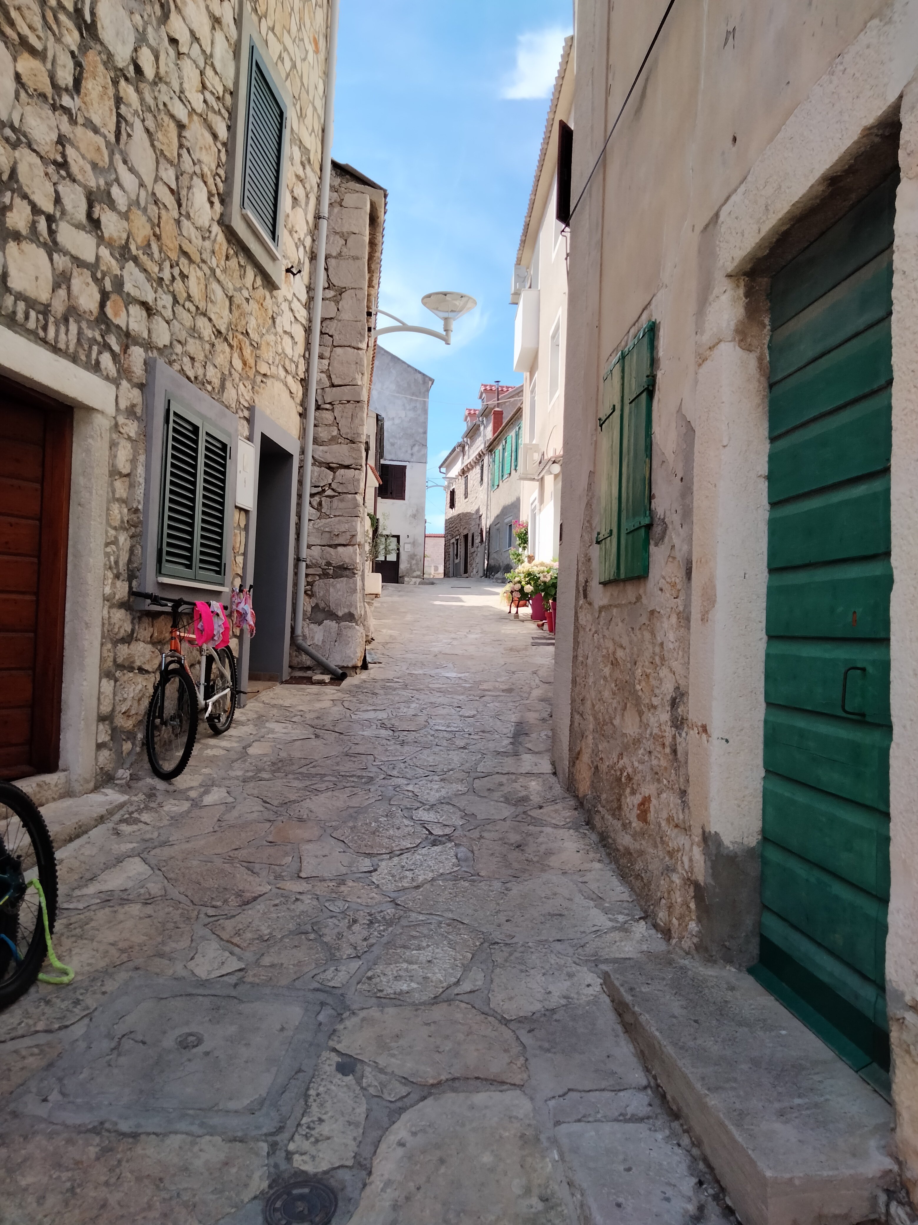 In der ferne sah man vom Camping aus ein kleines Dörfchen, so klein und fein. Ich dachte mir das kann ja nicht so weit sein und watschelte mit meinen Flipflops los. Bald war die Haut, zwischen dem grossen und dem Zeigezehen, aufgeribscht und die Flipflops schmerzten. Also zog ich sie aus und lief Barfuss weiter. Wie das ausging, dazu später. Vor dem Dörfchen hatte es einen schönen kleinen Hafen mit einer kleinen Werft wo gewerkelt wurde. An dieser Stelle muss ich zugeben, dass ich ganz gerne anderen Menschen beim arbeiten zusehe. Das Dörfchen war ganz süss und so wie ich mir ein kroatisches Dörfchen vorstelle. Unzählige kleine, verwinkelte Gassen die an schönen alten Häusern vorbei führen. Zum Abend essen gab es dann feine Meeresfrüchte als Koratioenabschluss, denn am Tag darauf ging es schon auf die Fähre nach Italien. Zurück im Zelt angekommen brannten meine Füsse, denn ich habe sie auf dem heissen Asphalt verbrennt, dumm. Den Tag lies ich dann am Strand ausklingen, genoss den Sonnenuntergang und sammelte Muscheln. Dass die eine noch eine „lebendige“ war merkte ich erst Zuhause.