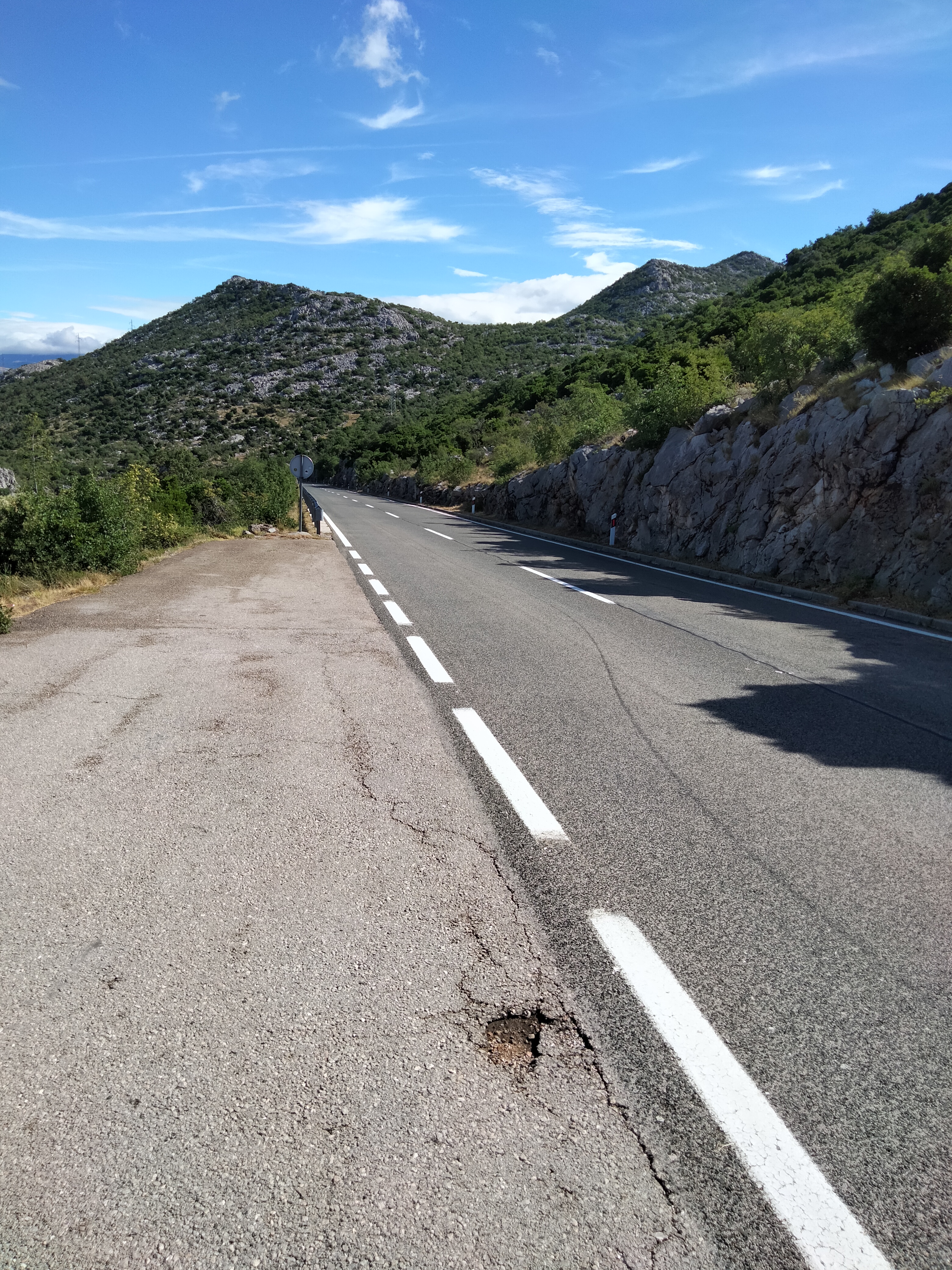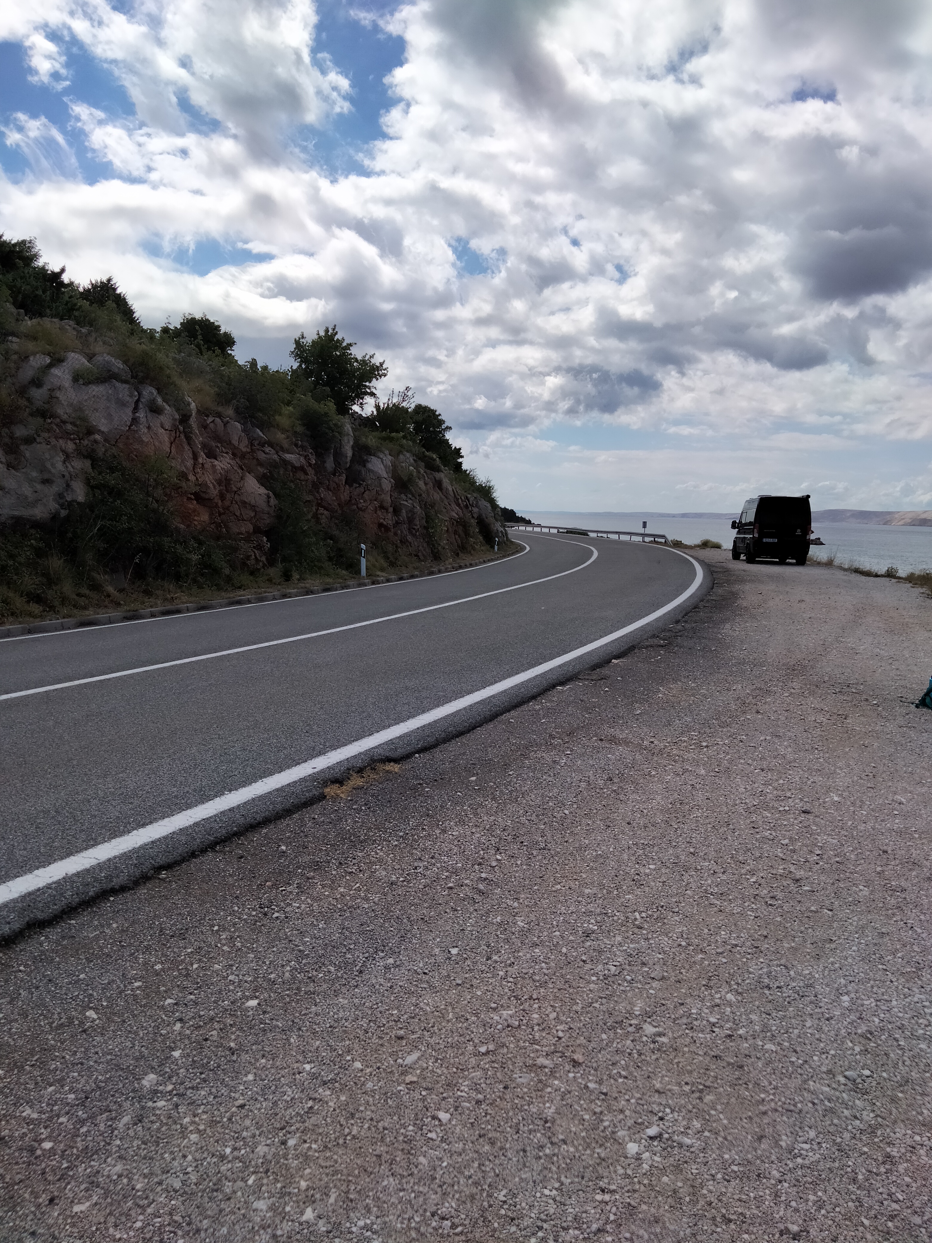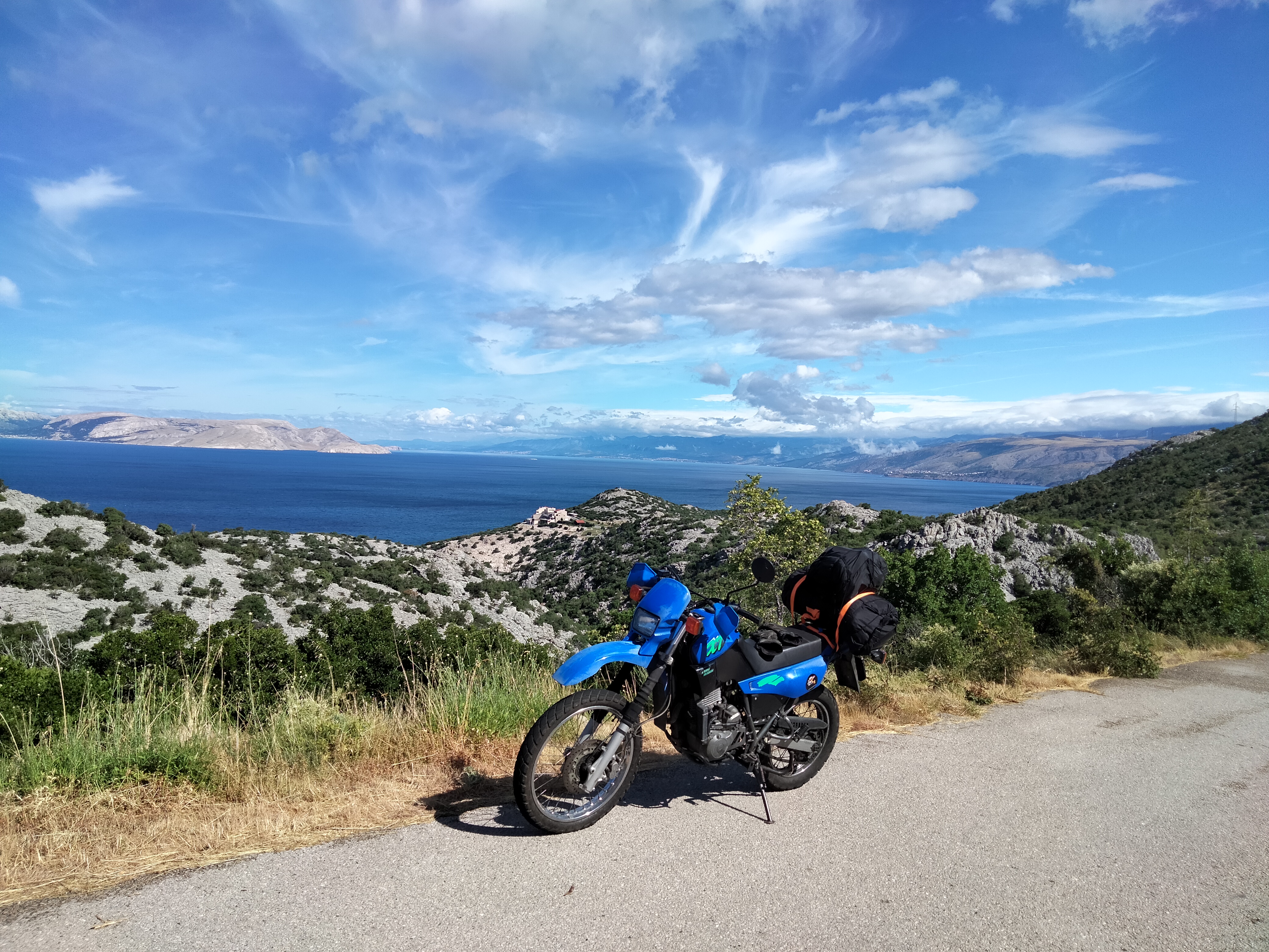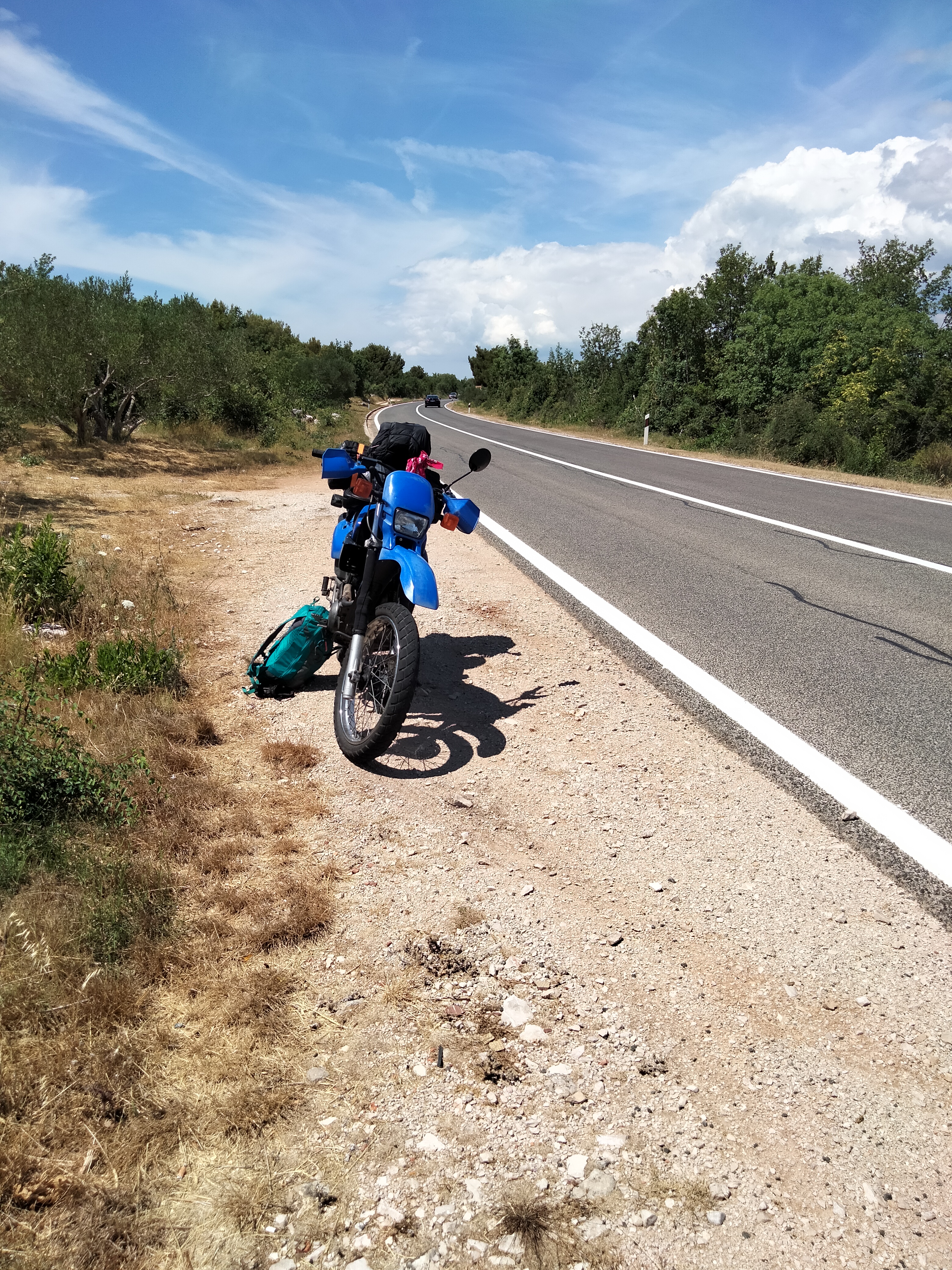 Nach dem Niederschlag in der Nacht, steh ich etwas zerknirscht aber sehr zufrieden auf und baue mein Camp ab. Dies geht eigentlich schon ganz schnell und zügig. So zügig, dass alles verpackt ist und ich mit angezogenen Motorradklamotten und Helm, merke dass der Schlüssel in den Badehosen ganz unten im Gepäck liegt. Schnell war aber wieder alles verpackt und der Schlüssel im Zündschloss. Es war ein wunderschöner Tag, ich war so zufrieden dass mir die Augenpisse die Backe runter lief. Es nahm mich so mit weil ich das machen konnte von dem ich seit klein auf träumte. Mir ging es so gut dass ich ohne Stress ein paar Kilometer hinter einer BMW GS nachtukerlte. Ich fuhr weiter der Küste entlang. Nach einem kurzen Tankstopp kam mir die Gegend plötzlich bekannt vor und als ich dies zu ende gedacht hatte sah ich das Schild Paklenica. Vor etwas mehr als Zehn Jahren war ich hier klettern, das war bis auf einen groben Sturz eine sehr schöne Zeit hier. Über Zadar ging es in Richtung Split. Am nächsten Tag soll es da auf die Fähre nach Italien gehen, deshalb entschied ich 100 km vor Split einen Camping zu suchen.