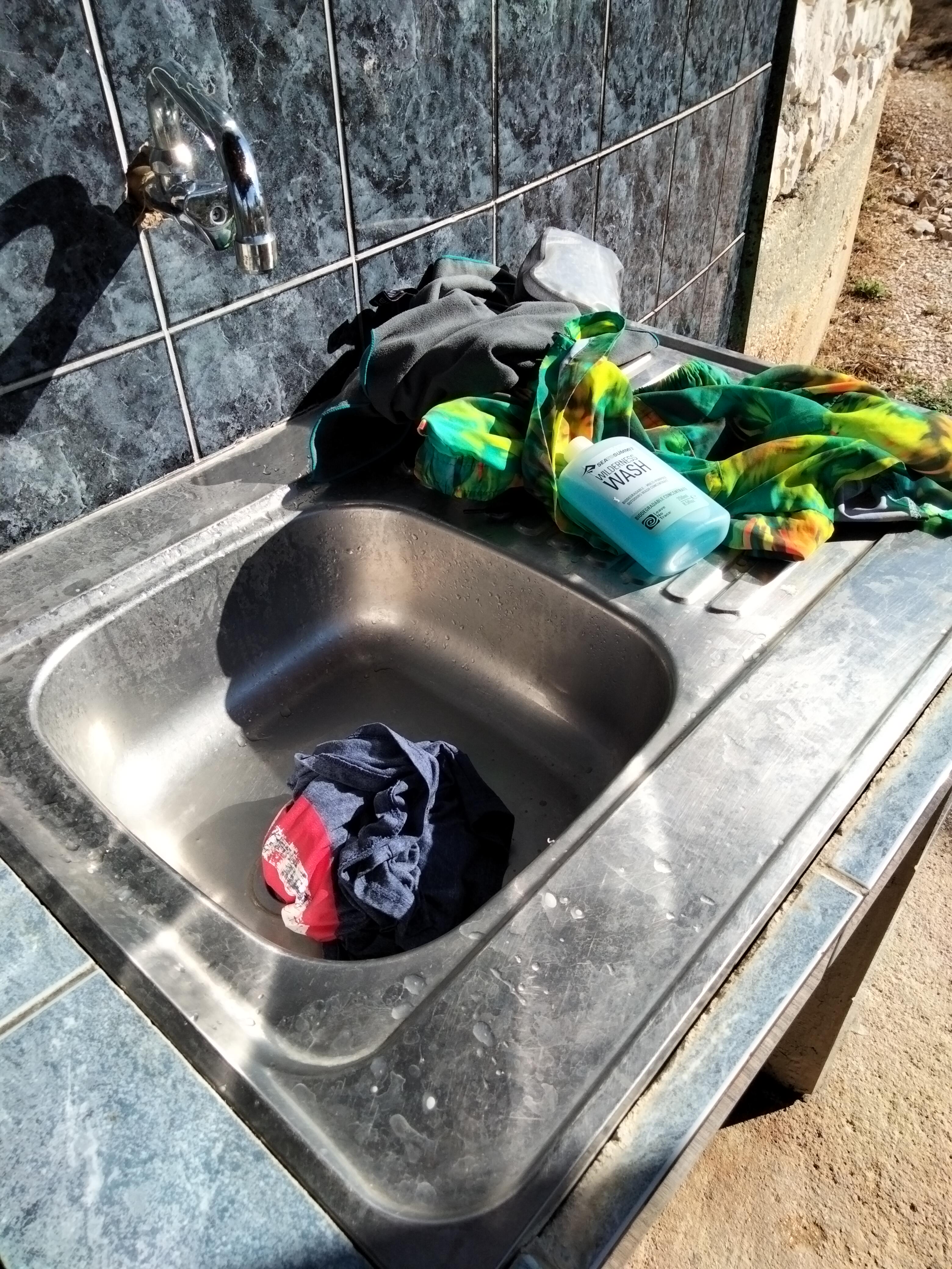 Der Camping war wunderschön und lag am Meer. Er heisst Plitka Vala. Der Nachbar war ganz nett und kam gleich mit einem Schnaps, war fein. In Kroatien heisst Danke übrigens havala(chvala ausgesprochen). Nach dem ich mein zelt aufgebaut hatte und den Schnaps getrunken war, mussten noch die Kleider gewaschen werden.