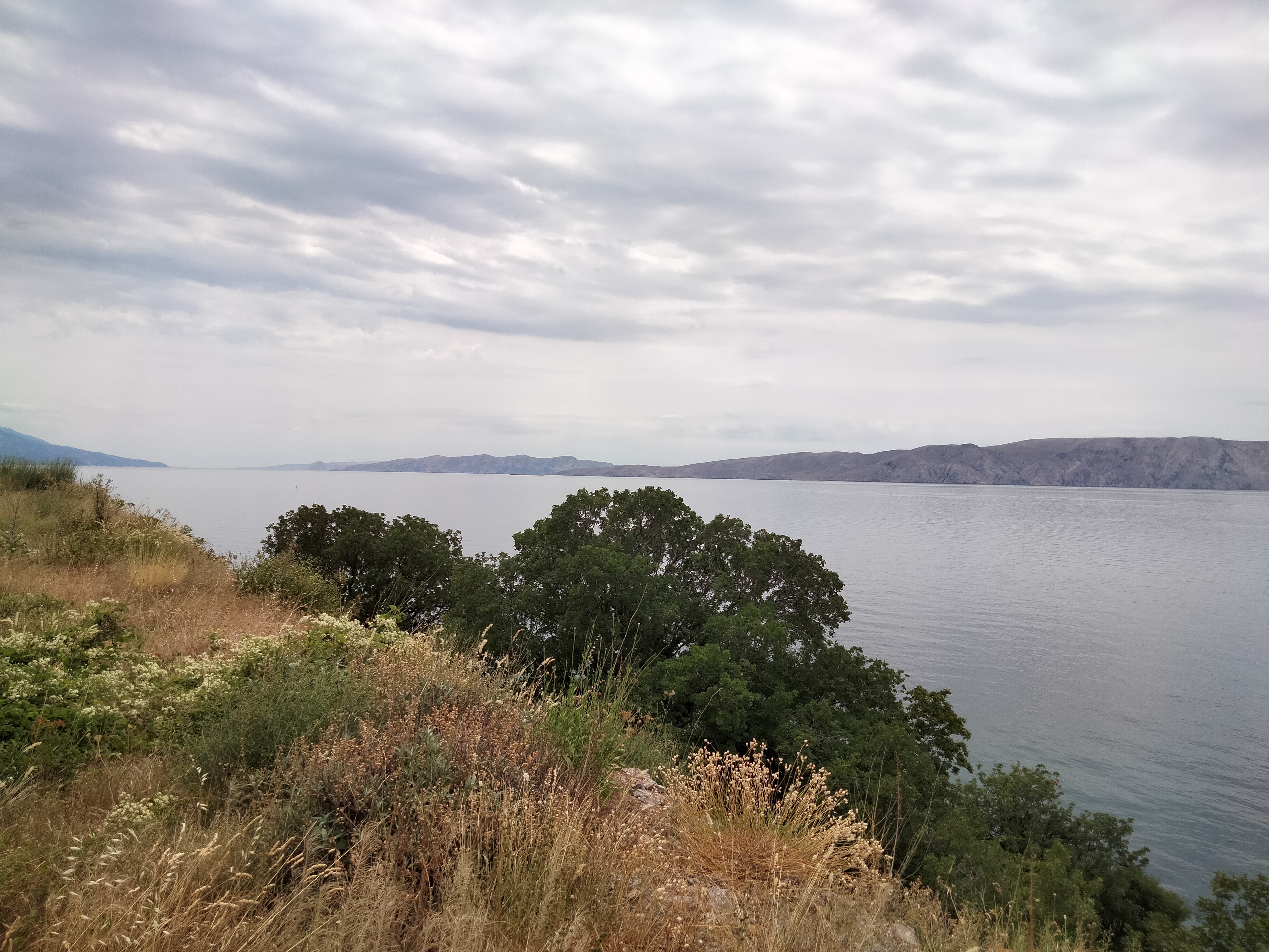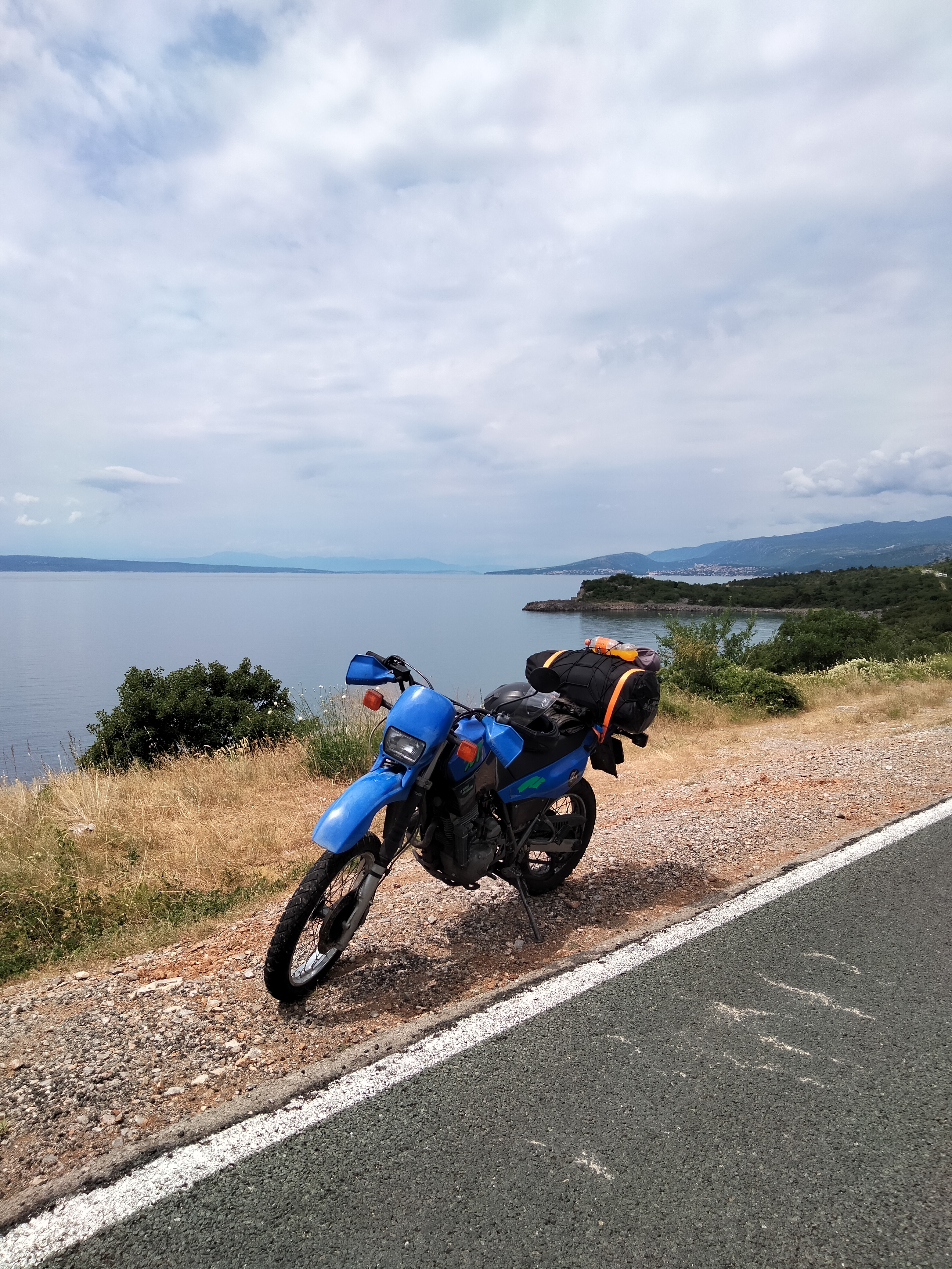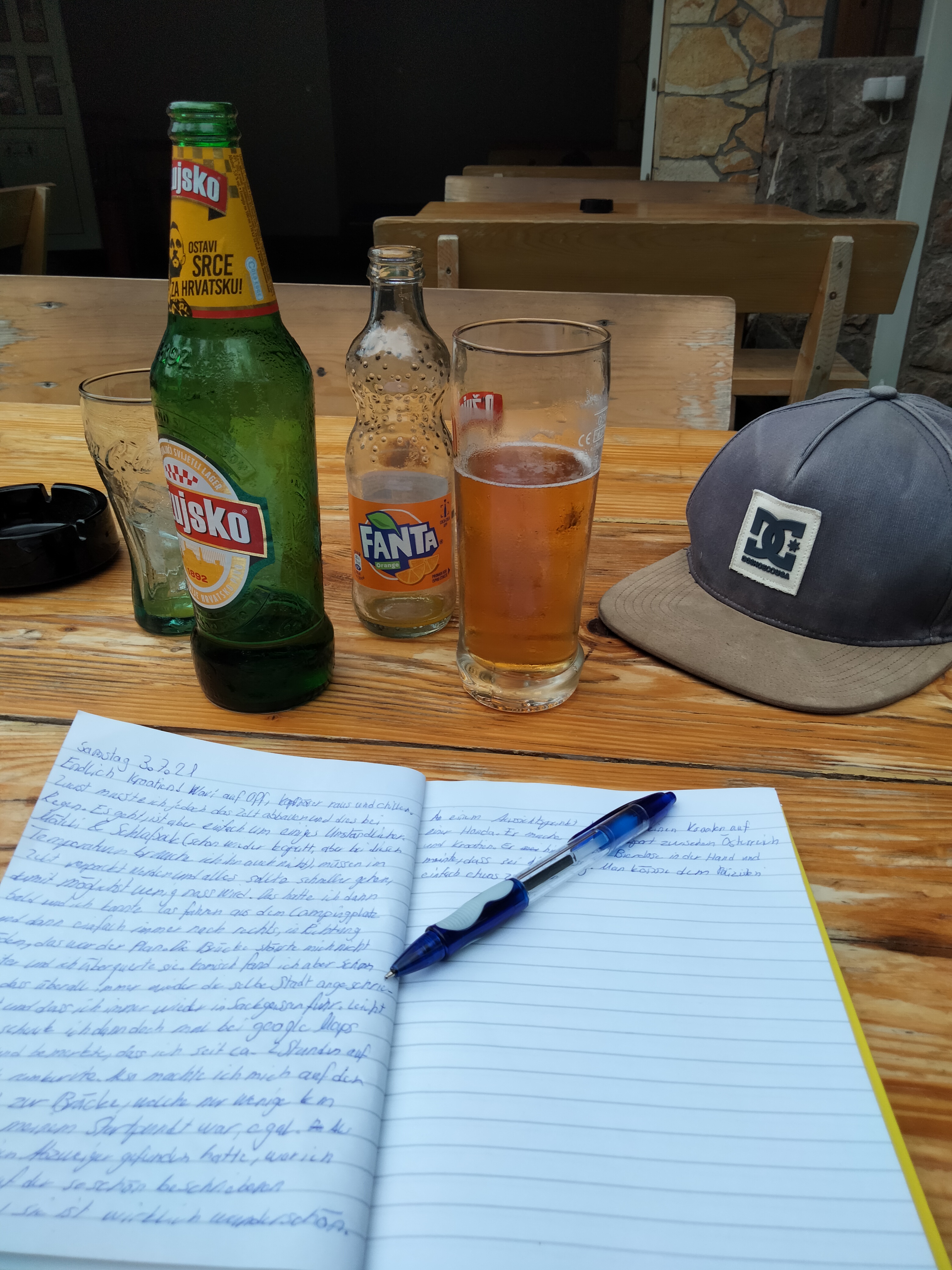 Auf diesem Camping, es hiess übrigens Ujca, gab es natürlich auch ein kleines Restaurant. Dort sass ich mich dann am Abend hin und schrieb diese Zeilen in mein Tagebuch. Während ich da so schrieb, etwas ass und ein kroatisches Bier genoss, fing es an zu regnen und alle Gäste mussten unter das kleine Vordach. Wir verteilten uns an die wenigen Tische und ich sass zu einem jungen Paar, dass überraschenderweise aus der Ostschweiz kam. Sie waren in meinem alter und wir kamen ins Gespräch. Es ist schön auf einer solchen Reise Menschen zu treffen die die selbe Motivation haben und ihre interessanten Geschichten zu hören. Die zwei waren mit einem Dacia und einem Dachzelt unterwegs und es war ihr letzter Tag bevor sie wieder nach Hause fuhren. Irgendwann ging es dann doch ins Zelt und ich legte mich hin. Das Wetter wurde nicht besser. Und da zeigte sich auch der einzige Nachteil dieses Campingplatzes, der Boden war sehr steinig und ich konnte das Zelt nicht richtig im Boden fest machen. Es begann richtig fest zu regnen und der Wind wurde auch immer stärker. Der Regen kam gefühlt von unten und es wurde ungemütlich im Zelt. Draussen sah ich die Lichtkegel der Taschenlampen von den anderen Campern die nochmals alles wegräumten und festzurren. Ich war zu müde für Stress und legte mich in die Zeltmitte wo es noch trocken war. Am nächsten Tag, sah man am Innenzelt was es bedeutet wenn es von unten regnet, es war bis 30cm vom Boden weg braun. Beim zusammenpacken freute ich mich dass ich meine alte XT dabei hatte, es kamen immer wieder Familienväter, die erzählten dass sie auch mal so ein Motorrad hatten. Dass es eine XT und keine DT ist und dass sie 600ccm und nicht 125ccm hat ist ein Detail, Hauptsache ich kam mit Menschen ins Gespräch. Was mich bei diesen Gesprächen jeweils beunruhigt ist, dass alle ihre Motorräder verkauft hatten weil sie Kinder bekommen haben.