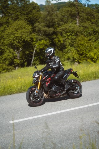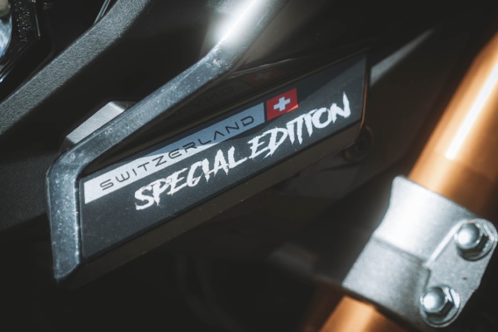 Wenn man nun «Suzuki GSX S 1000 EVO» ausserhalb der Schweiz sucht, wird man nicht fündig. Denn die Evo-Modelle gibt es nur in der Schweiz. Sie haben ein anderes Dekor, ein kurzes Heck und eine SC-Project Auspuffanlage. Die SC-Project-Anlage wurde extra für die Suzuki GSX S 1000 EVO gebaut, was auch auf dem Auspuff zu lesen ist. Die S 1000 GT mit der originalen Auspuffanlage klingt schon sehr schön. Die SC-Project-Anlage aber noch ein bisschen schöner. Ist nicht nervig laut, dass man Kopfschmerzen kriegen würde, aber man hört das Motorrad gut.