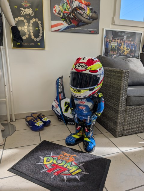 Sie haben bei ihnen im Showroom eine spezielle Ausstellung zu unserem gemeinsamen Jubiläum gemacht. Mit ein paar Pokalen von mir und paar alten Sachen. Es wäre natürlich geil, wenn man das irgendwie mit einem Kombi, mit einem Sepicaldesign feiern könnte, das ist eigentlich eine gute Idee, das könnte ich mal anfragen. Das ist aber immer etwas kompliziert mit den ganzen Team und Yamaha Sponsoren und Marken.